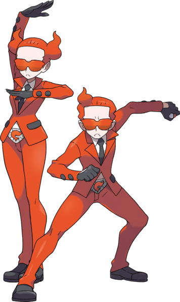 In a rare show of courtesy, wild Pokémon do not appear at random here, but instead guard particular shadowy spots in the tunnel system – as a result, it takes me a while to be sure I’ve caught everything in here, but I think I’ve got everything: Rhyhorn, Onix, Solrock, Lunatone, Machop, Cubone and Mawile, who has been promoted to Steel/Fairy – a potentially interesting statement about the definition of our new type, something I’ll have to discuss once I’m familiar with all the new Pokémon in this game. Although disorienting, the Glittering Cave’s tunnels aren’t long, and I soon emerge into a brighter, more open chamber – where I meet Team Flare.