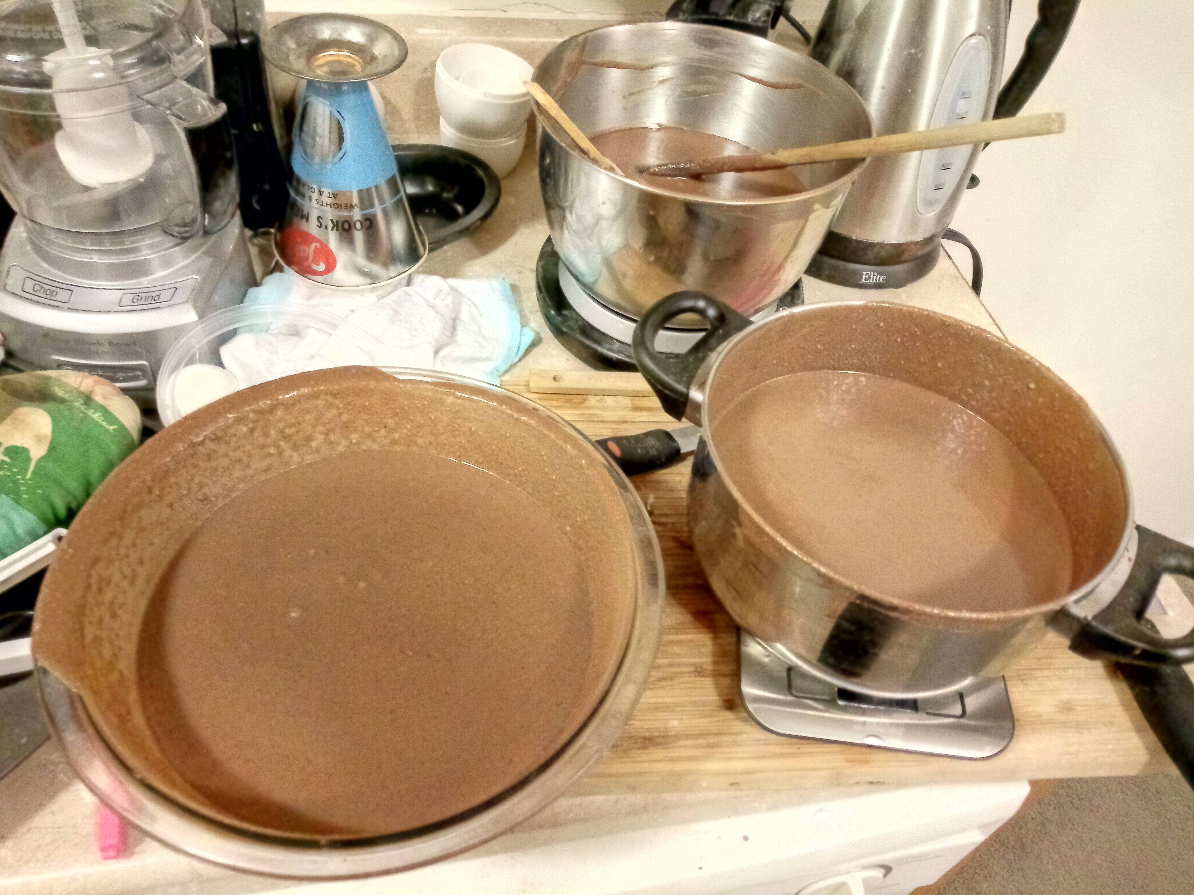 I have a perfectly good chocolate cake recipe that incorporates canola oil and yoghurt to create a heavy, moist, decadent cake, and I’m using some nice Dutch-process cocoa that I bought the last time I was home in New Zealand (America: you do many things right, and I generally have great respect for your baking, but you do not understand chocolate). It’s fantastic, I’ve used it before for all kinds of things, it’s tried-and-true, etc. The trouble is I need a lot of it, and I only have a fairly small stand mixer.