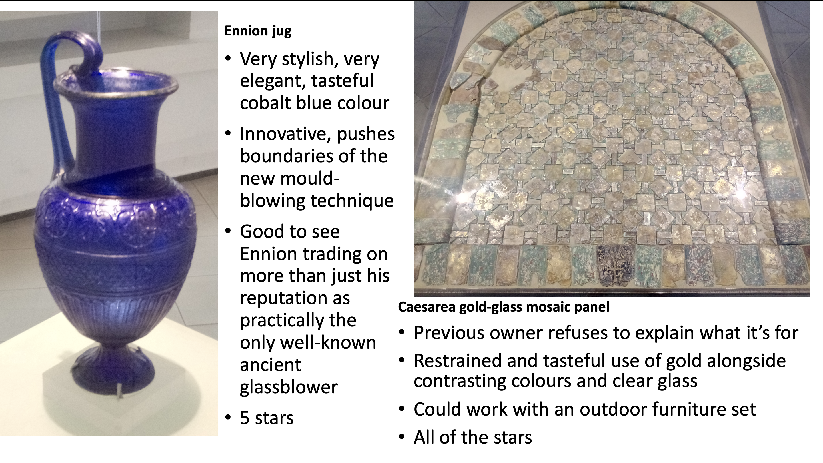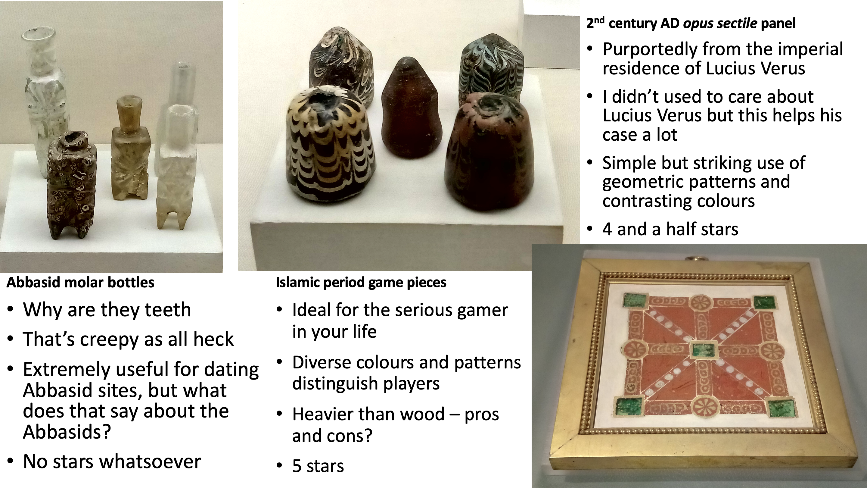 On Thursday I went to the Eretz-Israel museum in Tel Aviv, and because I am a huge glass nerd (and, y’know, I’m doing tourist things as well but I am technically in this country to study ancient glass) I spent basically the entire time in their glass gallery ogling pretty Phoenician core-formed alabastra and Roman mould-blown bottles. So my reduced posting schedule this month doesn’t sting too much, here’s my definitive expert review of all the things there that most stuck out to me: