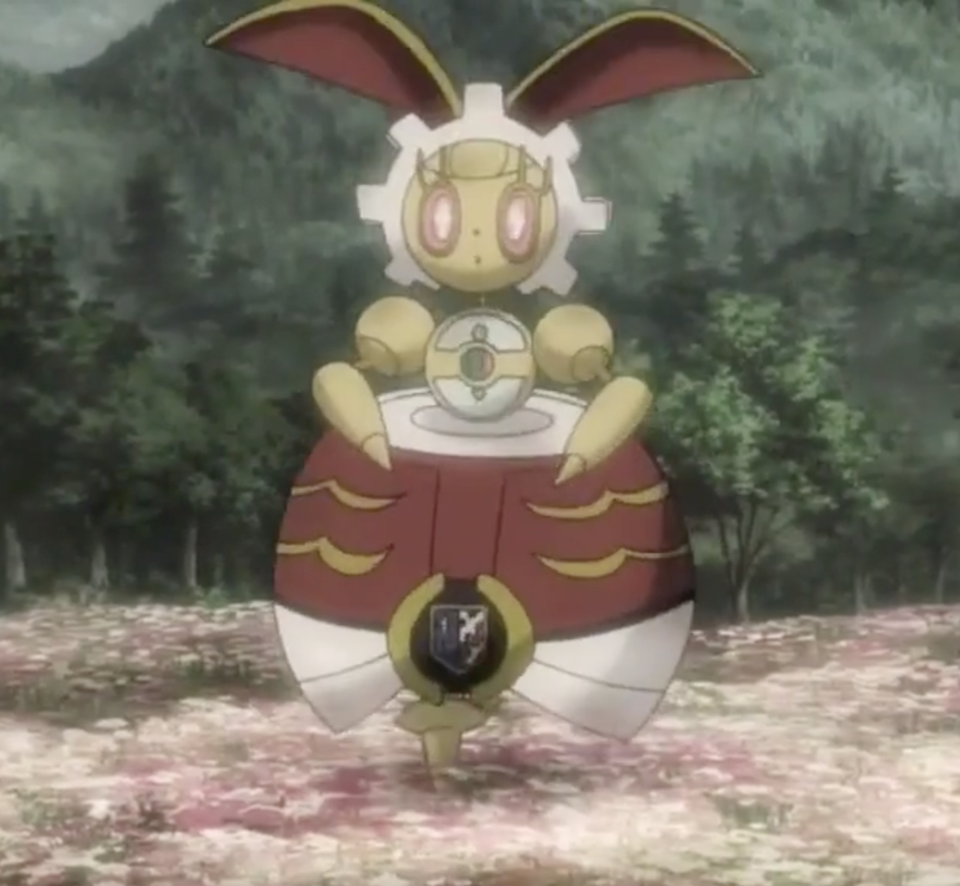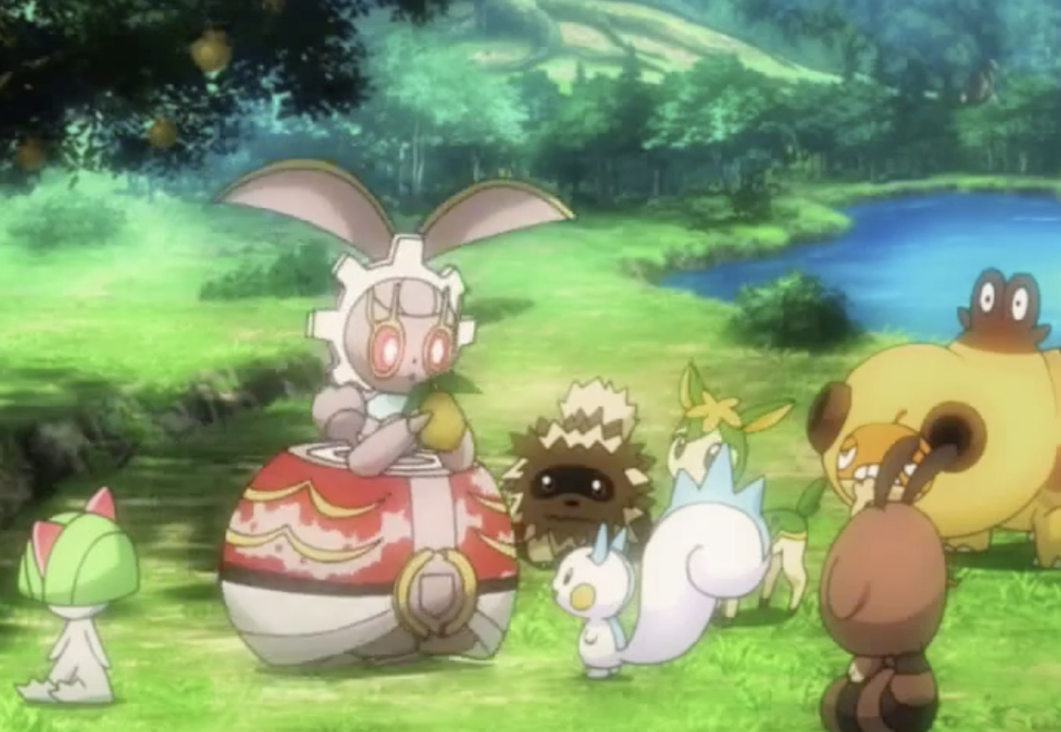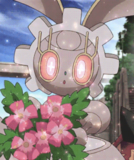 The movie shows us a couple of Magearna’s abilities that the games don’t hint at. When startled or in danger, it can collapse its entire body into a Pokéball-patterned sphere; in this state, it is one of the only things capable of withstanding Volcanion’s explosive outbursts. The Sun and Moon website also claims that it does this when it sleeps, or when it is sad. Part of a Pokéball’s purpose is to keep Pokémon safe and give them a place to rest while travelling, so this makes a great deal of symbolic sense. Somewhat less practically, Magearna can make bouquets of bright pink flowers appear at the ends of its arms (if these are supposed to be specific real flowers, I’m not sure what kind, but possibly primrose or hibiscus). Magearna does this several times throughout the movie to cheer people up or indicate esteem, and it is, believe it or not, a semi-important plot-point that the flowers make Volcanion sneeze. The flower trick is presumably why Magearna’s signature move in the games is Fleur Cannon (fleur meaning “flower” in French). This function was meant to delight the young princess that Magearna was built for, but you could also imagine it being repurposed as she grew older; at diplomatic events, for instance, she might have wanted Magearna to present gifts to foreign dignitaries.