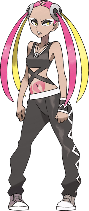 At the end of the game when she challenges the player at the Pokémon League, Plumeria gets a new look featuring a Z-Ring and cap with the colours of her partner Pokémon, Salazzle.