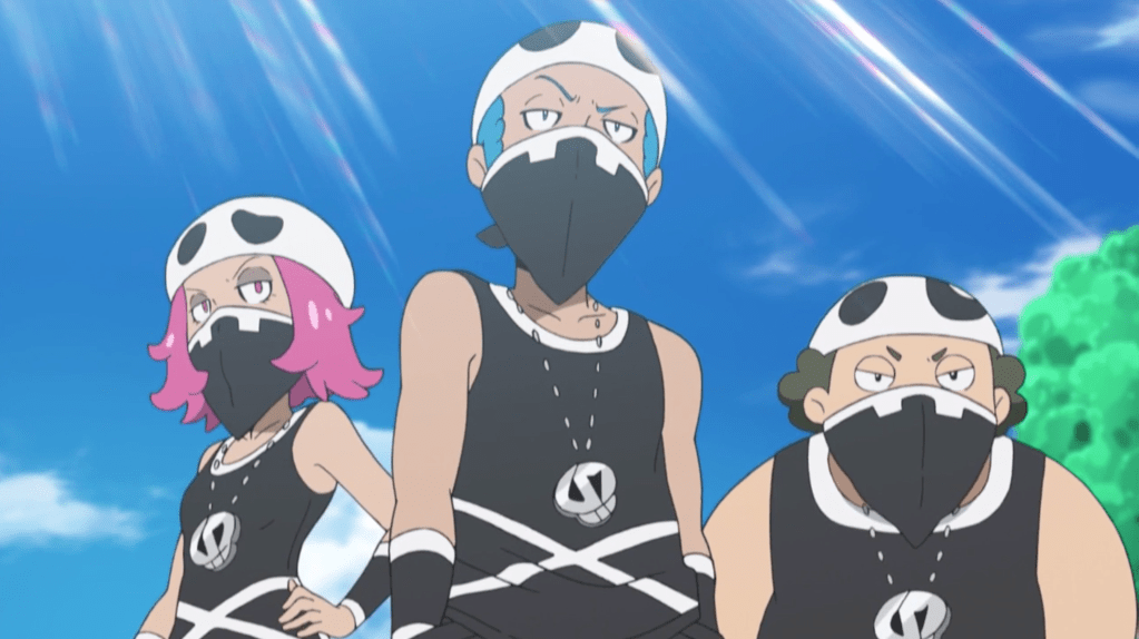 Team Skull are the fake-out villains of Pokémon Sun and Moon.  They have the same “Team” (Japanese 団/dan, “gang”) title as every villainous organisation in all the previous games of the core series (and most of the spinoffs), and they are established early on in the story as troublemakers who are well known in Alola for acts of vandalism and disturbing the peace.  However, they have no grandiose plan – no legendary Pokémon to enslave, no bizarre ideology to enact, no ancient prophecy to fulfil.  They don’t really “want” anything, other than perhaps to hurt the people who, in their view, have hurt them, and even on that point they can be fairly half-hearted at times.  Real large-scale villainy, in a classic Pokémon mould, is entirely Lusamine’s department in this story.  Their lack of vast world-changing designs make Team Skull most similar to OG Team Rocket.  Team Rocket, though, were effectively the Pokémon Mafia: organised crime, with a chain of command, vast resources, a network of fronts and laundering operations, and the capacity for a coordinated attack that brought Kanto’s largest corporation to its knees.  Team Skull, by comparison, are… well, a mess.  They steal Pokémon (badly), steal berries (for some reason), mess with the player’s first trial (inadvertently helping you to pass it), try to steal a bus stop (…yeah, I’ve got nothing) and generically harass people.  They’re only involved in anything big while they’re working for Lusamine, and even then, with the exception of Guzma himself, they’re kind of bit players.  The largest-scale plan any of them ever seem to have come up with on their own is Guzma’s initiative to steal all of the Buginium-Z crystals in Alola, hoarding them in a chest in his mansion so that no one else in the region can become a stronger Bug Pokémon trainer than him.  Guzma talks a big game, obsessing over brutal strength and destructive power, but the best plan he can think of to make sure he stays the strongest is to monopolise Buginium-Z crystals to give himself an advantage (Hala calls him out on this at the end of Sun and Moon, pointing out that the real point of a Pokémon battle is for both opponents to grow stronger, not for one to beat the other down).  He’s something of a paper tiger – and the same is true of Team Skull generally.