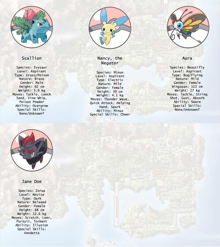 You move slowly back around the camp until you’re downhill and almost out of earshot again. Hidden behind a boulder, you bring out Scallion and Nancy the Negator to brief them and Jane on the plan. You decide to leave Cutie on your shoulder; she’s probably not in any condition to actually fight after battling Jane, let alone powerful enough to contend with whatever Team Rocket is packing, but she may as well watch.