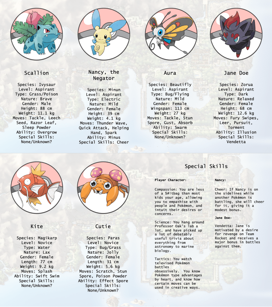 Oh, yeah, and what’s-his-butt’s here too. The Professor’s grandson. Grandson? Great-nephew? First-cousin twice removed? Whatever, he’s here. He’s in your class at school, and obviously you see him at the lab from time to time, but you’ve never paid much attention to him. One time you tried to strike up a conversation with him about a really interesting new research paper on the correlation between Clefairy moon rituals and the appearances of several known periodic comets. You’re fairly certain he didn’t understand a single word you said; he just called you a nerd, farted and then ran off. To be honest, you get the impression he has a really awkward relationship with the Professor and has transferred a lot of his feelings about that onto science in general. You felt a little bad when you realised that, and wondered if you should have made more of an effort to reach out to him, but… well, he is also kind of a dick.
