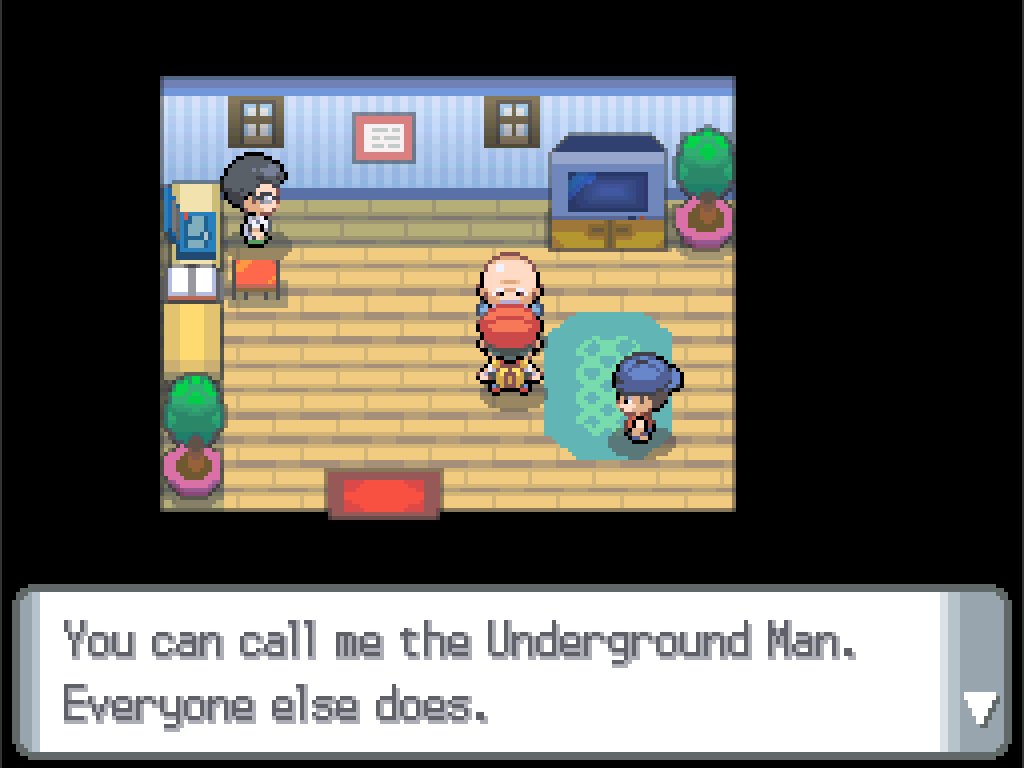 Eterna City is also where we get access to the Sinnoh Underground, with help from this groovy old guy. You can dig up all kinds of useful things in the Underground, like evolution stones and this rock shaped like a Shieldon’s face. The rules of this run explicitly allow gift Pokémon; I don’t know if that’s absolutely airtight on allowing Pokémon reanimated from fossils, especially on Diamond and Pearl where you actually have to go a little bit out of your way to find fossils, but personally I prefer to allow it. Next time we’re in Oreburgh City we can turn this chonky fren into a nice lil’ Shieldon.