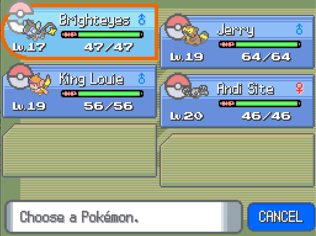 The team looks pretty well put-together now; the danger at the moment is that Jerry is not great at fighting Grass-types and Andi is just abysmal. And of course when we enter the gym…