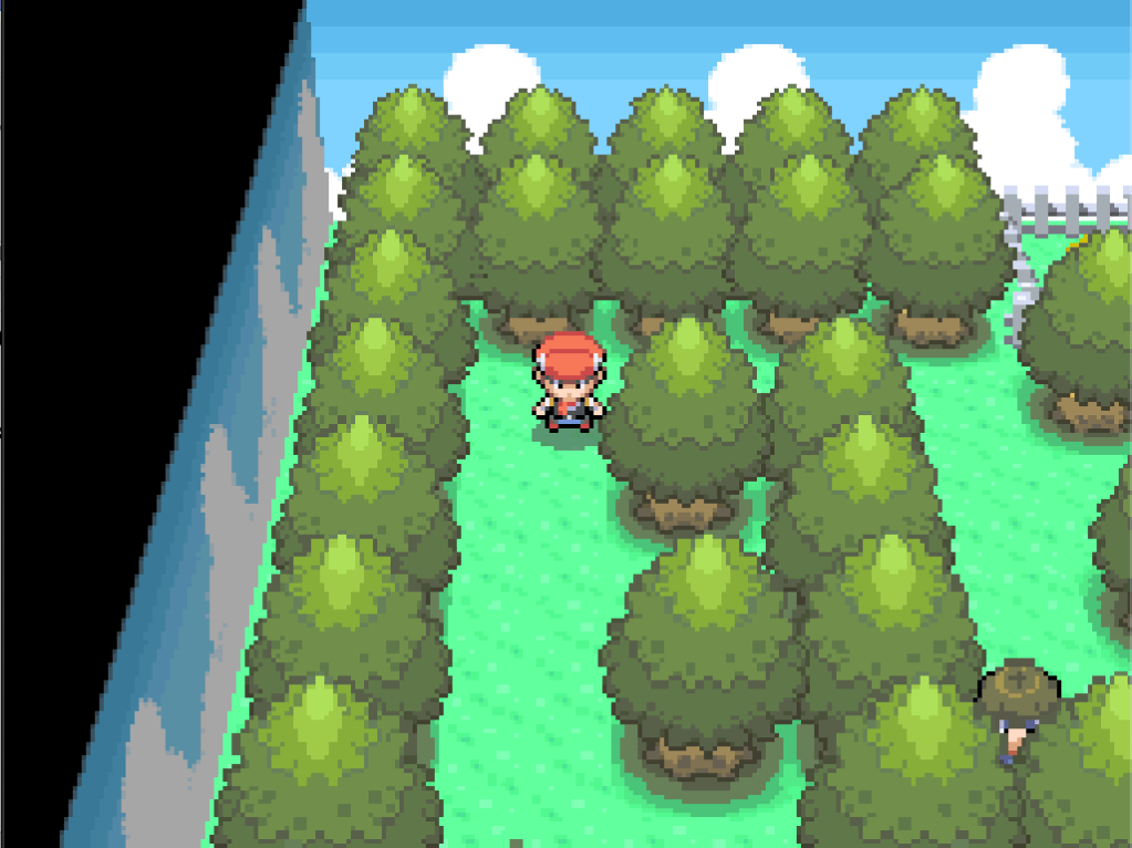 The gimmick of Gardenia’s gym is that she and all her trainers start off hidden, and you have to find and challenge each of the other trainers amongst the trees before Gardenia will reveal herself. Each trainer also gives you a hint to the next one’s location. This is one of the very few places the game takes advantage of its ability to render things from multiple angles (courtesy of the stronger graphical capabilities of the Nintendo DS, compared to what previous Pokémon titles were working with). One of the hidden trainers is actually in this image, but only a few pixels of her hair are visible – but if we move over to the left…
