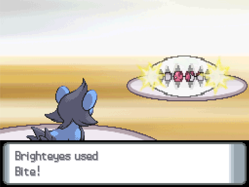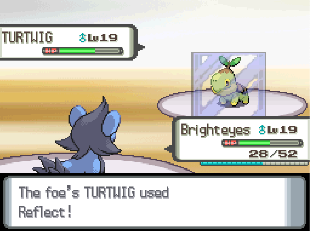 Gardenia’s Turtwig opens with Reflect. I’m not really in any hurry to take it down; I’d rather wait out the Reflect so Roserade doesn’t get the protection. Turtwig’s Razor Leaf isn’t that scary, and I can use some of the time to heal damage Brighteyes has already taken. Eventually Gardenia winds up using her own super potion on Turtwig – which, again, is fine; that’s a resource she won’t be spending on her more dangerous Roserade. Throughout all of this, though, only being able to attack with Bite every other turn is a pretty big stumbling block. I can use Leer to weaken Turtwig, but it never really sticks, because Gardenia’s Turtwig also has Withdraw.