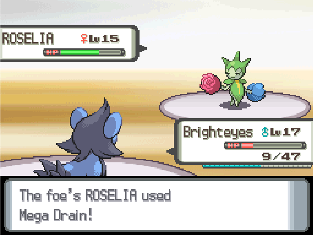 Unlike Cherubi or Budew, Roselia has the special attack stat to be actually pretty dangerous in the early game. Can’t switch out because of Waterfall, so I’ll have to heal.