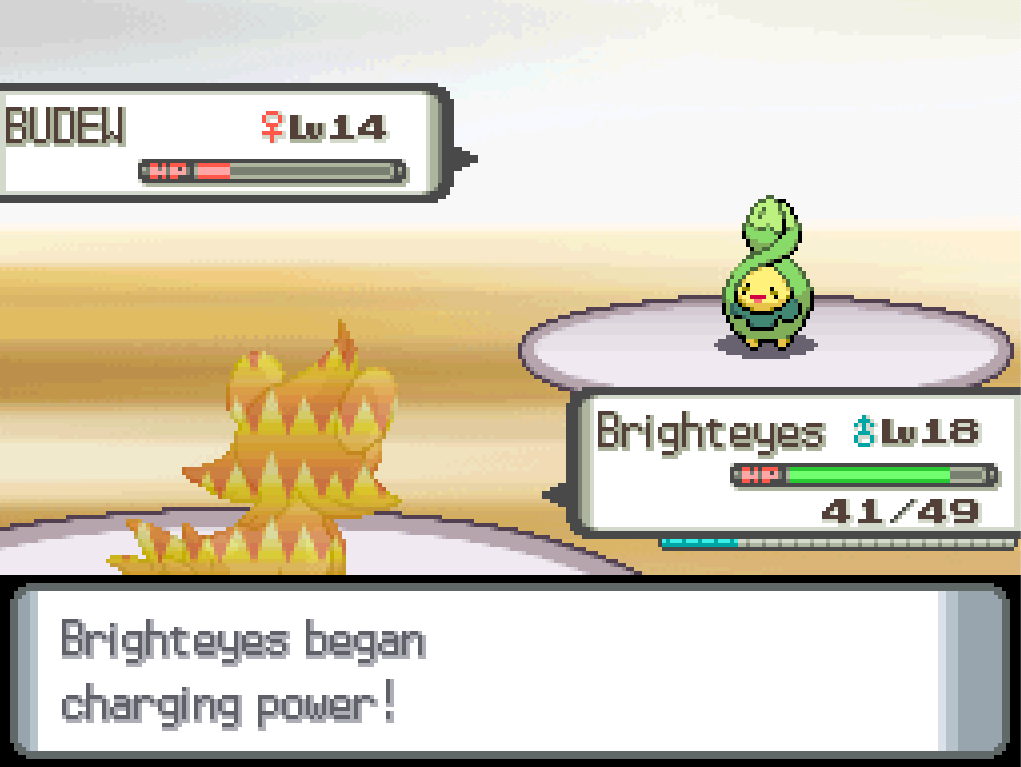 Charge’s main effect is to double the power of an Electric attack on your next turn, which is useless to me at the moment, but it also comes with a nice little bonus to special defence, which is not a bad opener in a Grass-type gym. In fact, the most dangerous thing about Gardenia’s team is easily her high-level Roserade’s powerful Grass Knot and Magical Leaf attacks – buffing Brighteyes’ special defence against her first couple of Pokémon might be a decent strategy to beat her without fire.