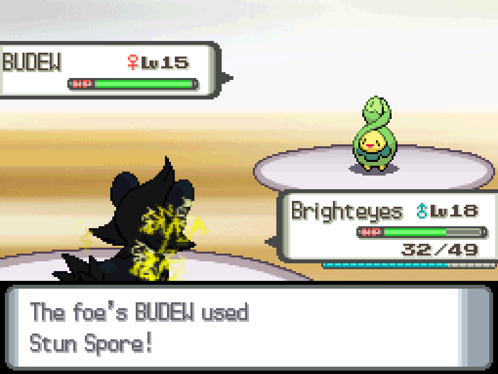 I open with my last super potion, which turns out to be the right move; Roserade is a fully evolved Pokémon with a sky-high special attack stat, and even with +4 special defence, Grass Knot stings. After that, Gardenia starts trying to be fancy, throwing around Poison Stings and Stun Spores. Things don’t really look good for Brighteyes, until…