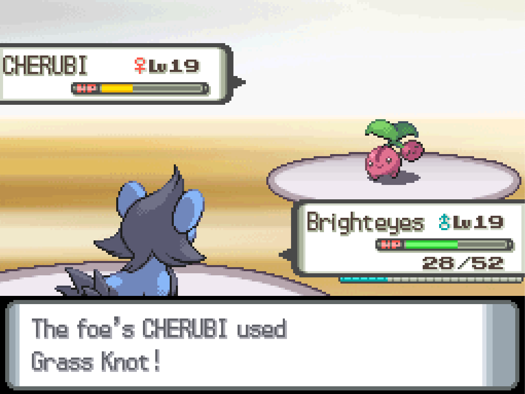 Cherubi boosting with Growth is a little bit scary, but I’m also buffing Brighteyes’ special defence with Charge. Even with a +3, Grass Knot isn’t all that scary.