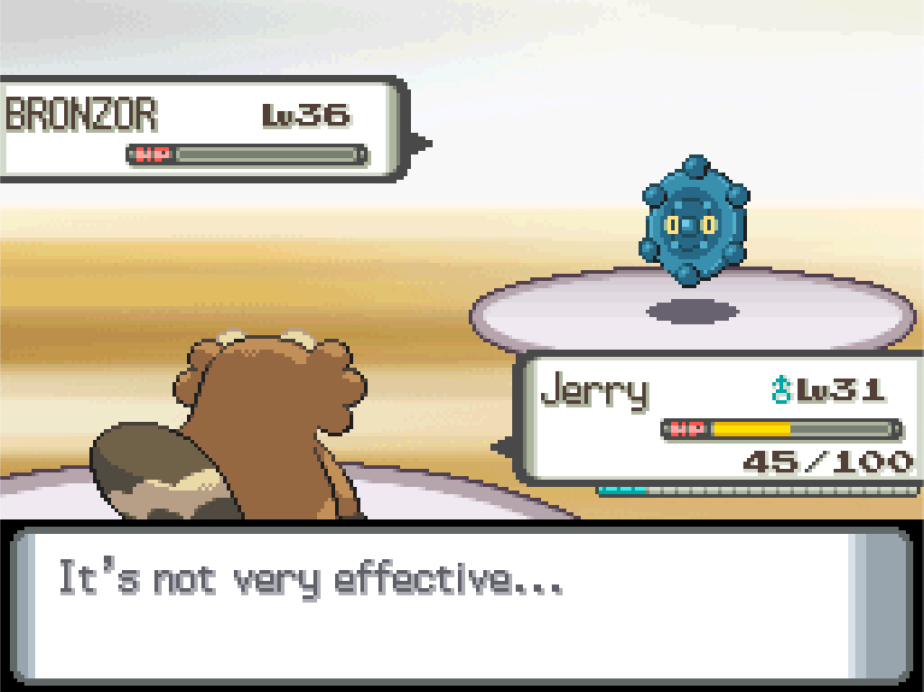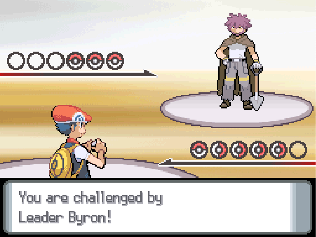 Twelve or so turns later, Bronzor is finally out of the way. Byron’s other Pokémon are higher level, but at least I have some idea how to attack them.