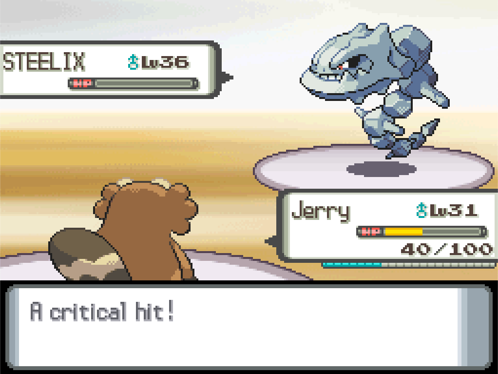 That was a crit with Dig; this is going to be another long one, but at least not as long as Bronzor. Steelix doesn’t seem like that much of a threat offensively either; so far it’s used Sandstorm, Gyro Ball and Ice Fang, and neither attack does much damage to Jerry.