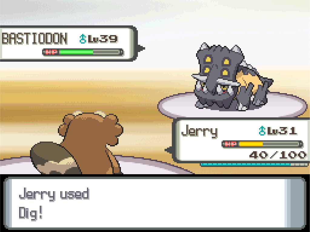 Bastiodon is another Pokémon without much offensive power to speak of, but its defences are also massive; I don’t expect Jerry to bring it down quickly, even with a double-weakness to Dig, but King Louie should be able to finish the job if this doesn’t work.