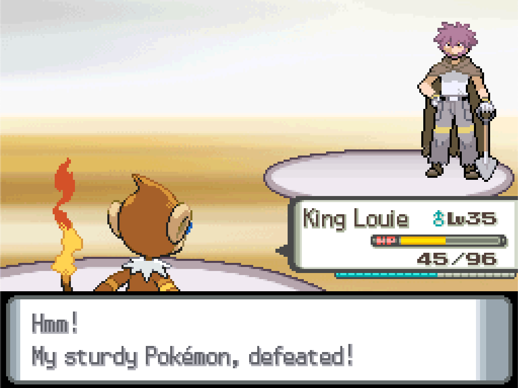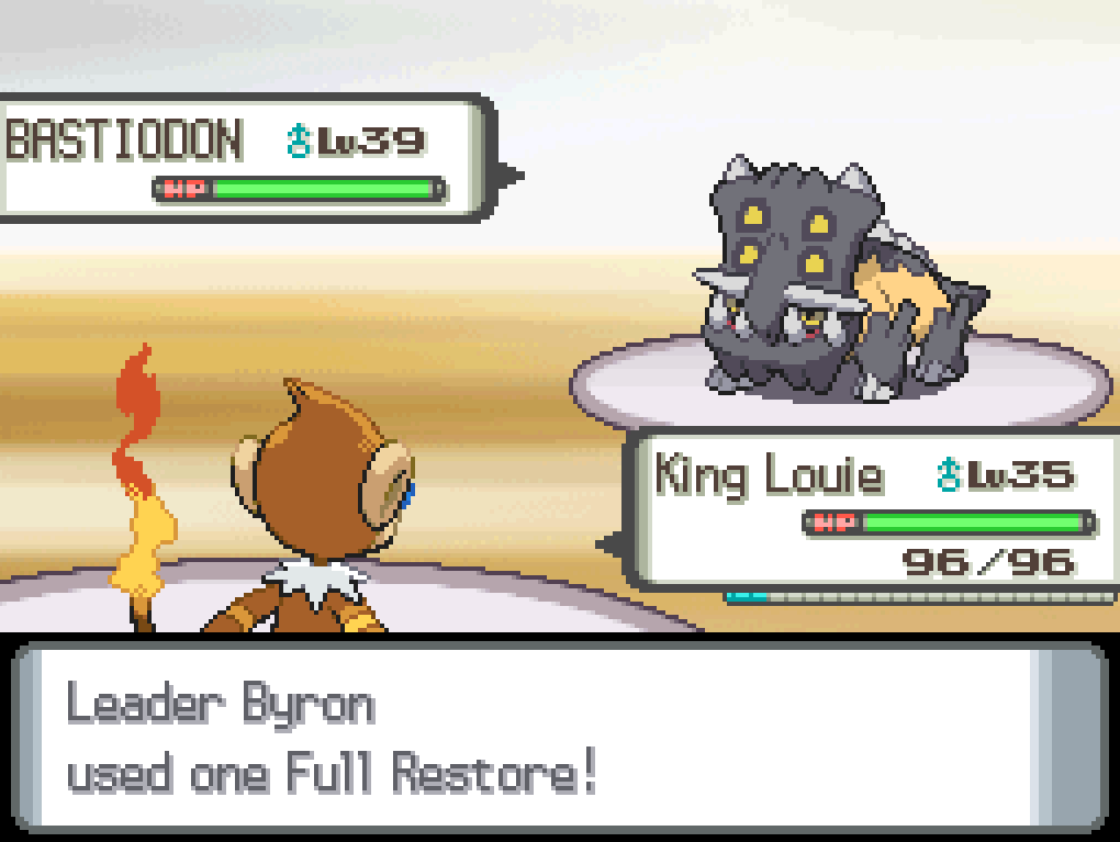Rest, on the other hand, could be tricky. King Louie isn’t doing damage fast enough to outpace that. On the other hand, with only Ancientpower and Flash Cannon as offensive moves, this Bastiodon only has 15 PP to actually attack with. I probably win the long game, even though it has the stronger defences.