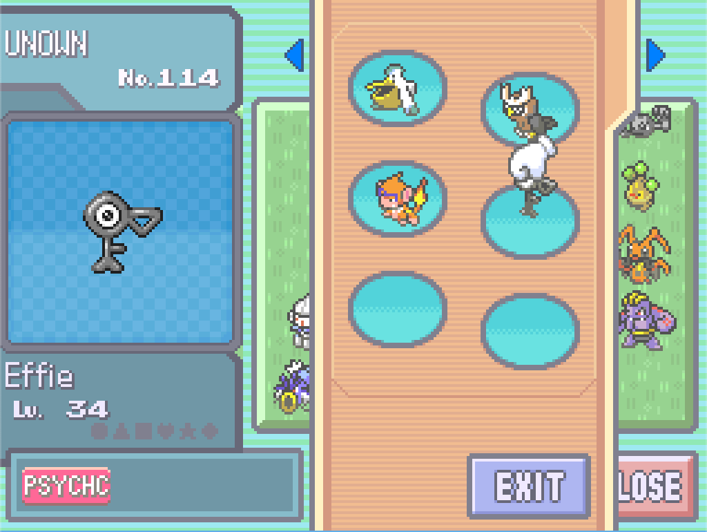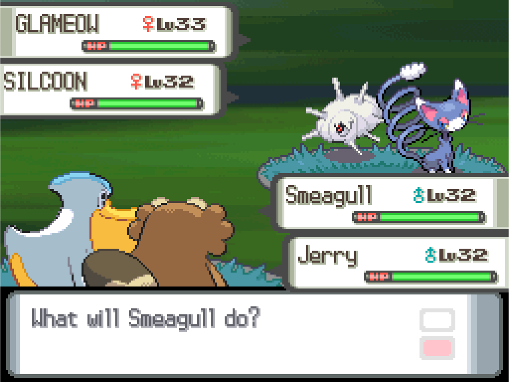 Well, we’re heading into a Steel-type gym; Monferno would normally be really good here, but King Louie can only use Grass Knot. Effie has Hidden Power (Ice), Tiktok has Confusion and Silver Wind, Smeagull has Quick Attack and Blizzard… we kinda need something that’s strong against Steel-types. I guess Karpe Doom has Dragon Rage, but Water/Flying is a lot of overlap with Smeagull. Dwayne the Machoke can’t use most Fighting attacks, but would do okay with Seismic Toss (fixed damage, so not affected by the Elements rule). Real Tree has Low Kick, but is also weak against Steel attacks and a pretty low level. Honestly, Jerry’s probably my best bet; he’s got Dig, he’s level 27, he can handle himself. I’ve got a couple of Rare Candies stashed away too and this seems like a decent moment to use them, so we can go into this gym looking something like…