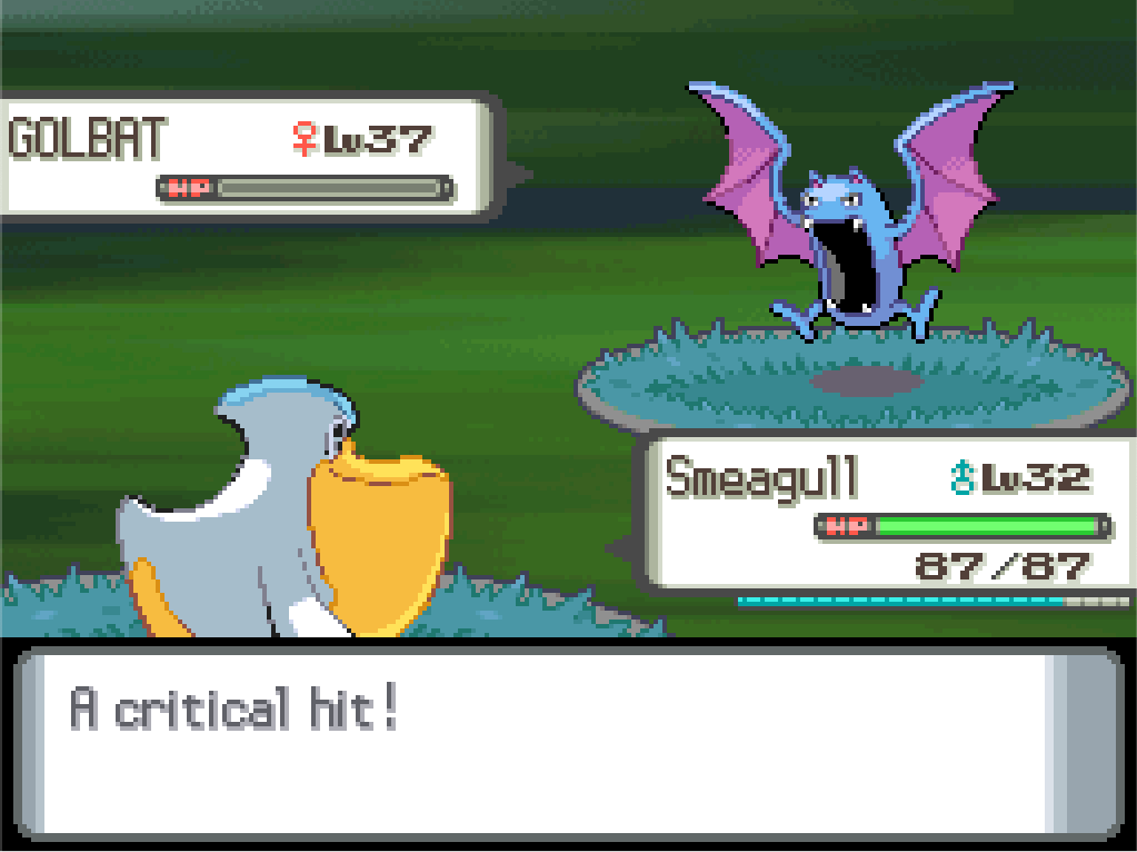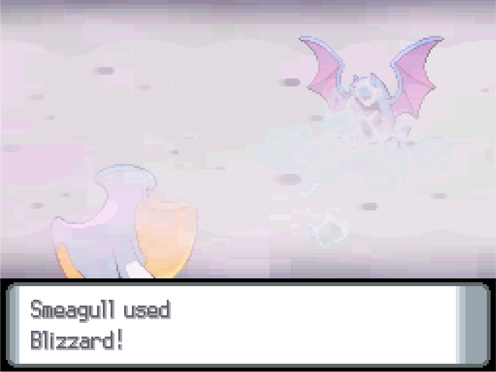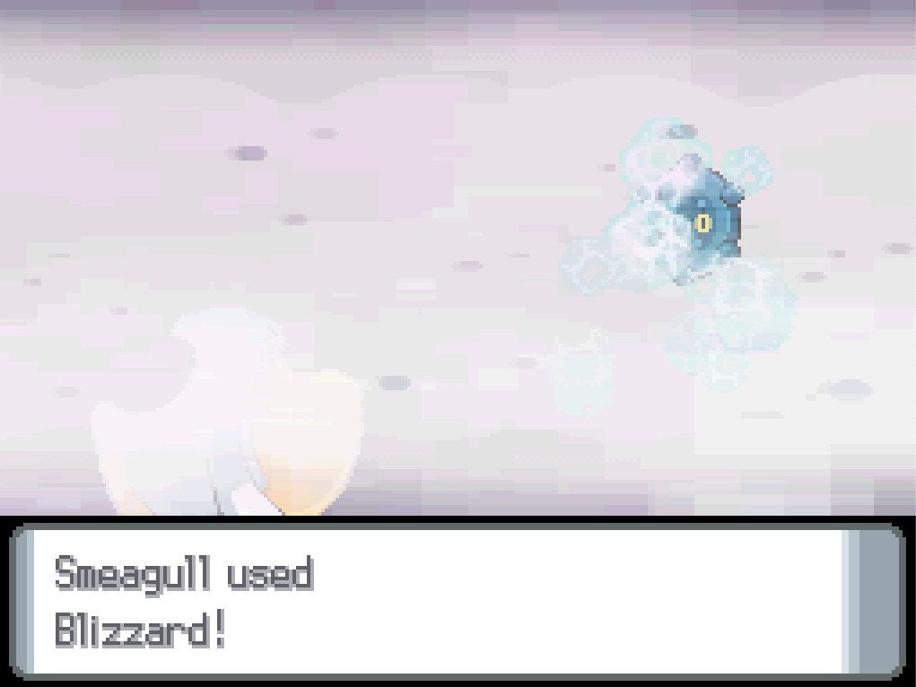 Although this is a Steel-type gym, not every Pokémon here is a Steel-type (because, to be honest, there just aren’t that many Steel-types in pre-national ‘dex Diamond and Pearl), so there are plenty of opportunities for Smeagull to contribute with Blizzard.