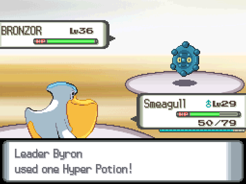 Flash Cannon is Byron’s signature move. It’s a solid move, on a Pokémon who doesn’t have the special attack stat of a raisin. Bronzor’s offensive presence is minuscule and it doesn’t have any way to buff itself like Fantina’s Drifblim did, but it can zap Smeagull with Confuse Ray and Hypnosis, and I fully expect Byron to spend at least one hyper potion on it.