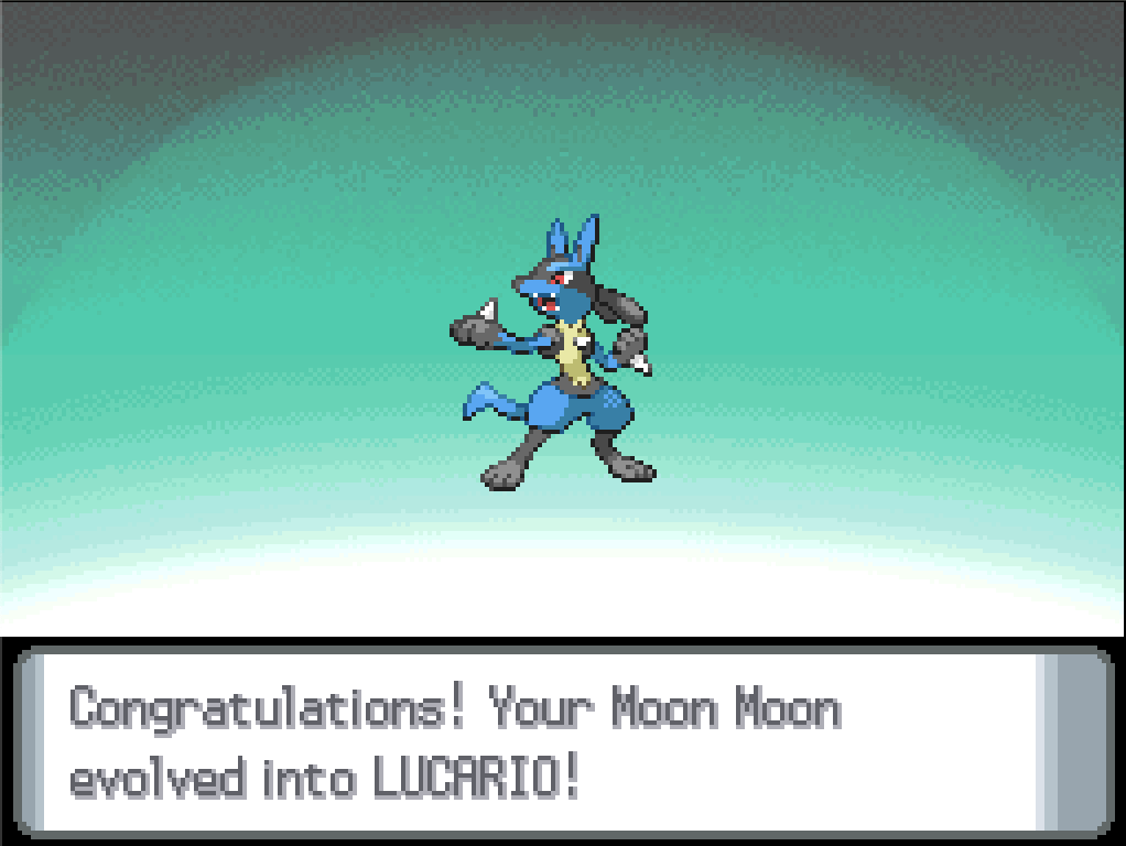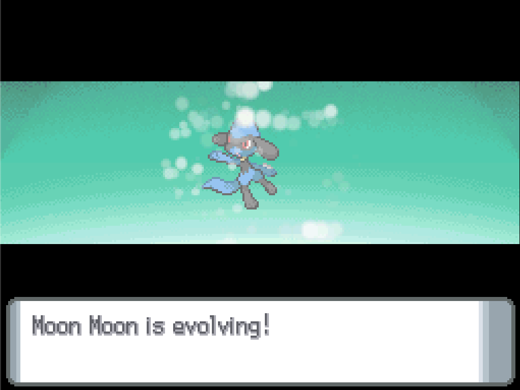 The last thing on my mind is that Riolu and Lucario have quite different level-up lists. I need Moon Moon to evolve by level 19 if I want her to learn Bone Rush (and exactly at level 19 if I want Reversal as well, but that’s less important). I’ve got her holding a Soothe Bell, I’ve given her all the vitamins I can afford, everything I can think of to boost that hidden “friendship” stat so I can become a Level 5 Friend and get access to her Secret Backstory (which, since I hatched her from an egg, is extremely uninteresting). And…