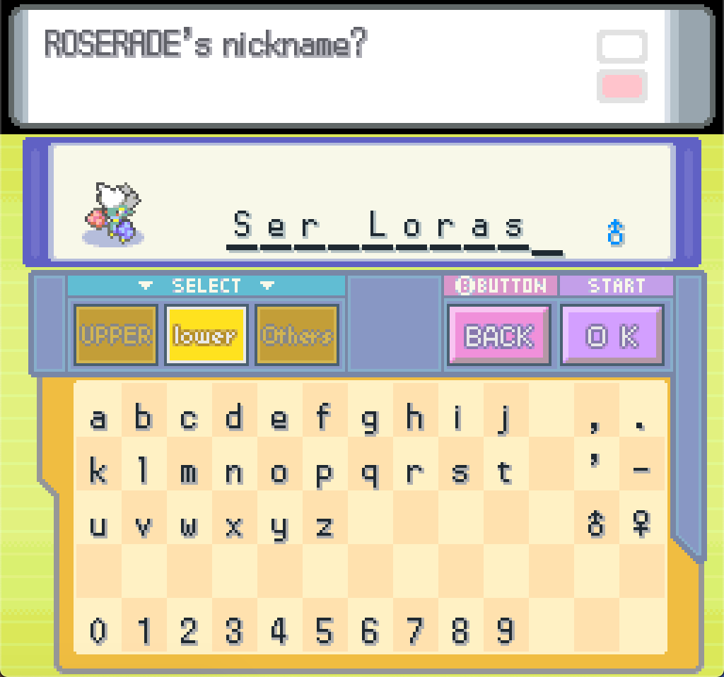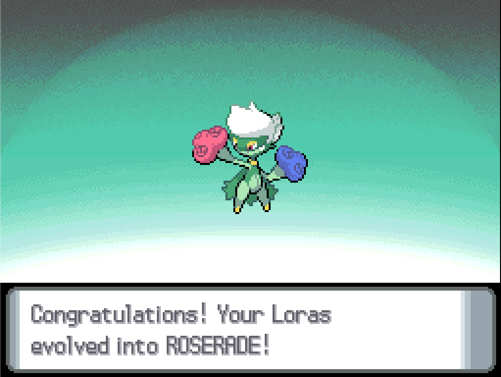 The next consideration is Loras. I have a Shiny Stone, which I can use to evolve him into Roserade at any time; the only question is whether any of the moves that he would only get as a Roselia are worth delaying that. Toxic at level 37 is probably worth picking up, Petal Dance at level 40 is powerful but unreliable, and beyond that it’s just utility moves (not having the Moon in play anymore means I can look this $#!t up again!). I think we’ll just grab Toxic and then…