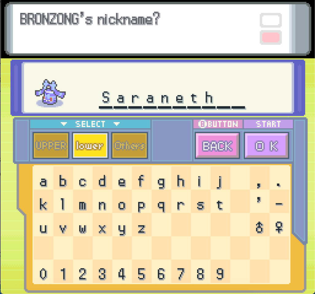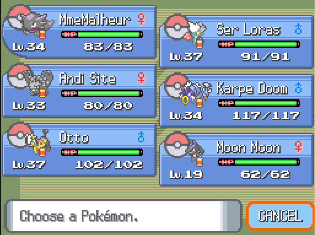 So, everything is wiped, all the existing rules are gone: no nature restrictions, no gender restrictions, no evolution restrictions, no restrictions on switching in battle, no fµ¢£ing Justice card hanging around for half the game telling me it’s super important that I keep using an Unown. But my entire team – my six highest-level Pokémon, including my starter, King Louie – are off-limits until further notice. In consultation with the comments section on my last post, I have chosen the following team to replace them, a mixture of old and new faces: