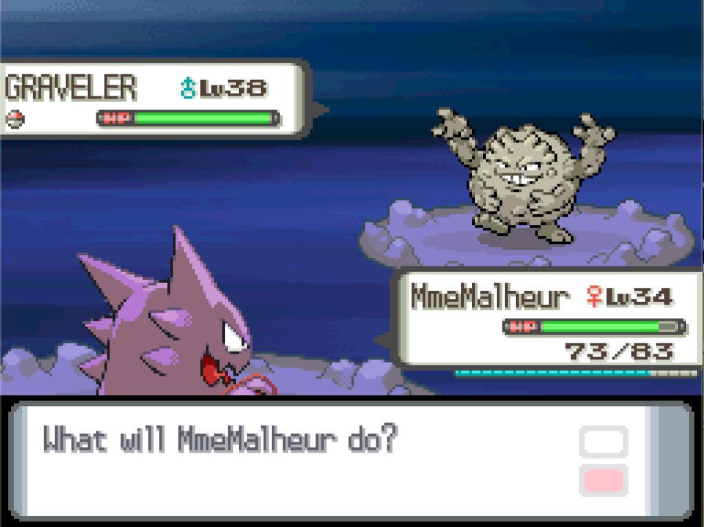 This is probably as good a time as any to remind everyone that I’m playing here on an emulator that’s been messed with using one of the functions of the Universal Pokémon Randomiser to allow trade evolutions to happen in a purely single-player environment. Graveler and Haunter should both evolve into their final forms at level 37.