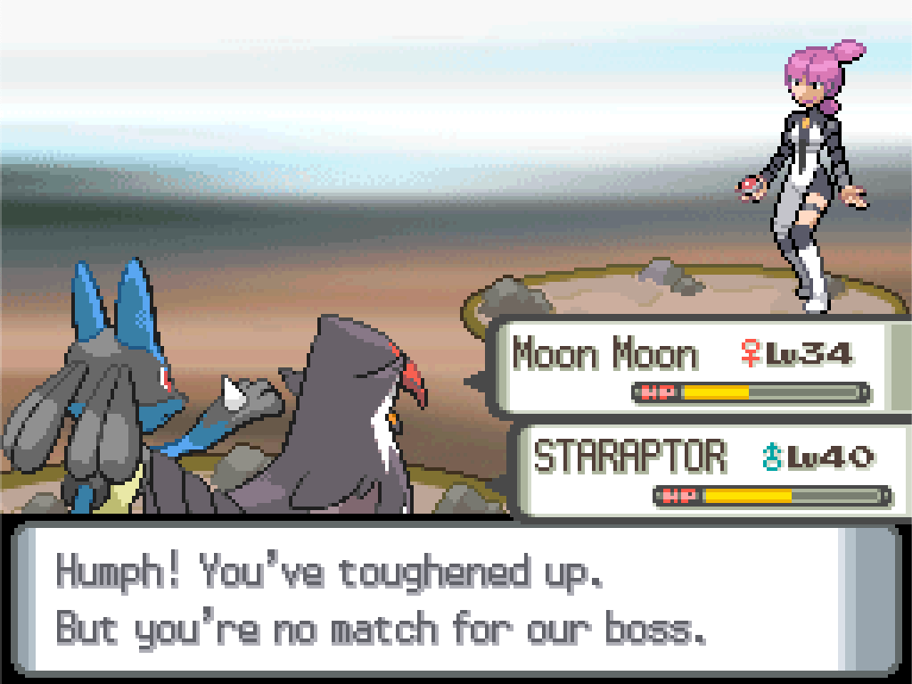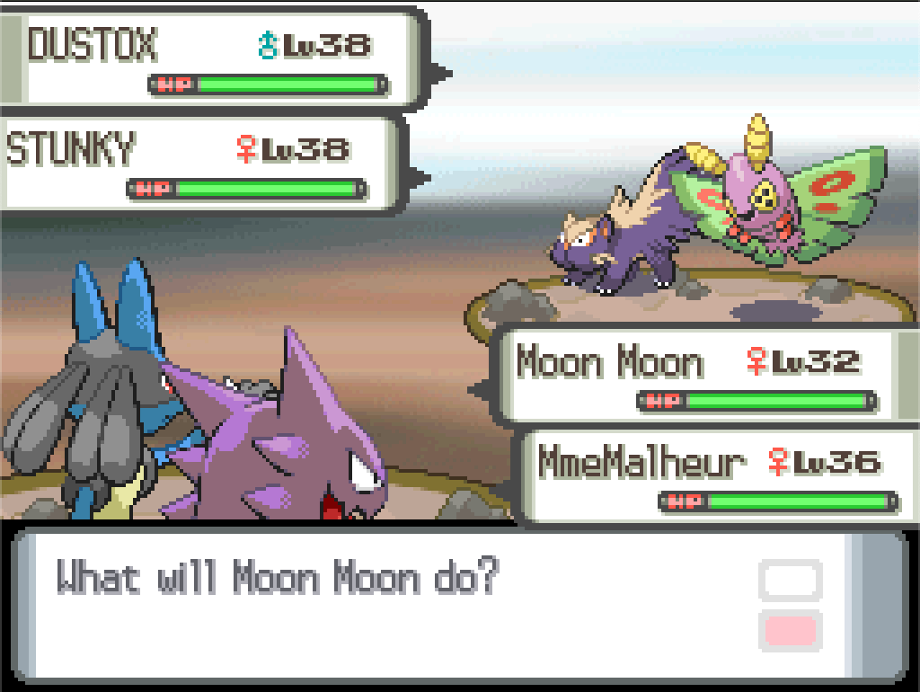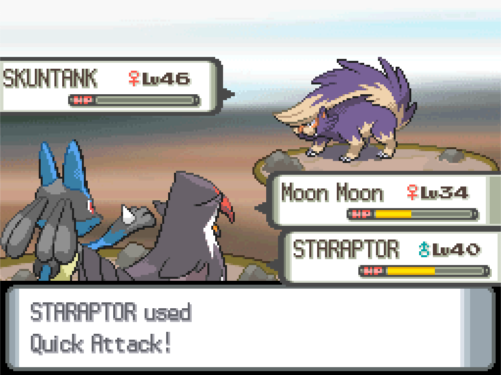 Probably doesn’t matter who I use now, since Staraptor should finish off Skuntank, but Moon Moon makes slightly more sense than Madame Malheur, just because Skuntank probably has Night Slash.