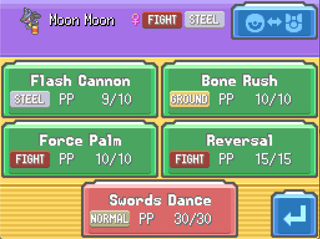 Swords Dance is in theory a really powerful move on Lucario, but with the Magician in play it’s useless for the foreseeable future; Moon Moon will be focusing on special moves like Flash Cannon and Aura Sphere. Then again, I may as well pick it up in case my plans change – it’s not like I’m going to be using Reversal either.