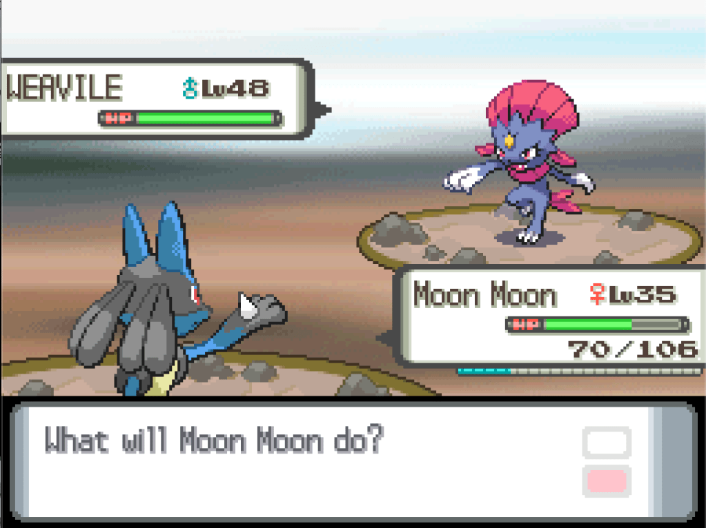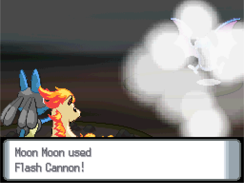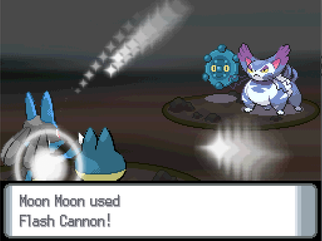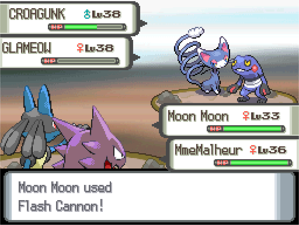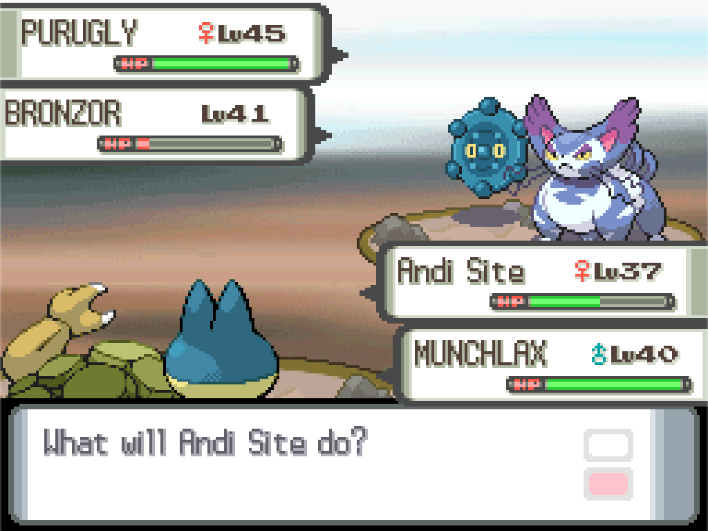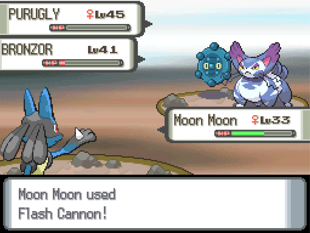 Okay, Andi’s Fire Blast is extremely bad against Mars’ Purugly (I think one of Purugly’s ability choices is Thick Fat, so it has a de facto resistance to Fire), so I’m going to switch back to Moon Moon.
