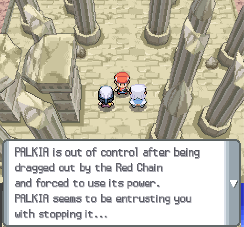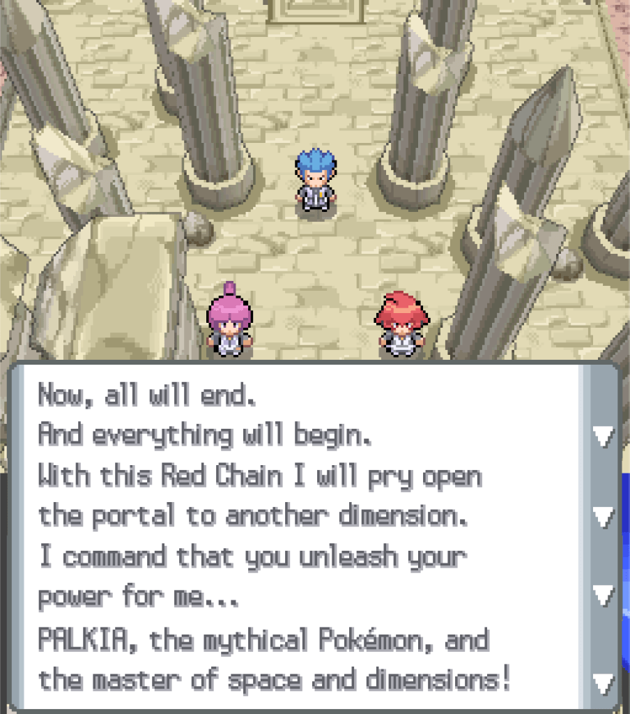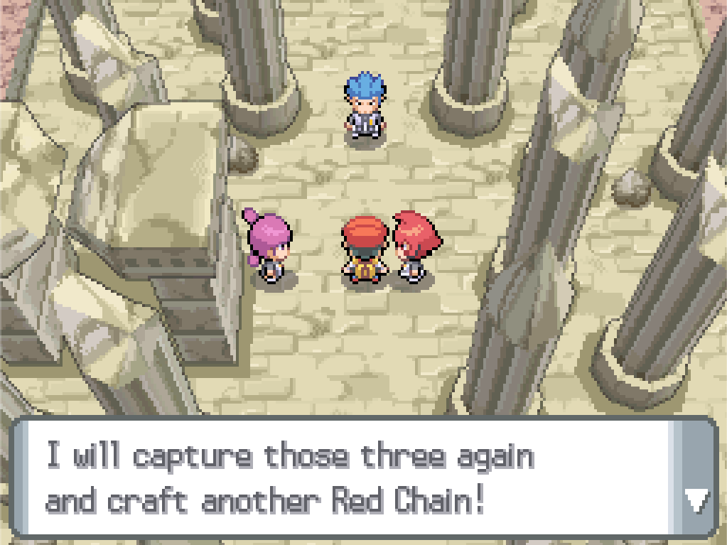 Something that’s always bothered me about Diamond and Pearl is how abruptly the Red Chain is introduced and how little it’s explained. Like, I definitely have my issues with Ruby and Sapphire’s Red Orb and Blue Orb, but at least we kind of understand what they are and how they’re connected to Hoenn’s ancient past before the exact moment they become critical to the fate of the world. It’s clear that creating the Red Chain is the reason Cyrus needed the lake spirits, and therefore the reason for most of what Team Galactic has done since we met them, but… how? Why? What???