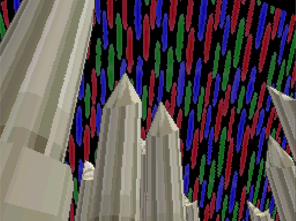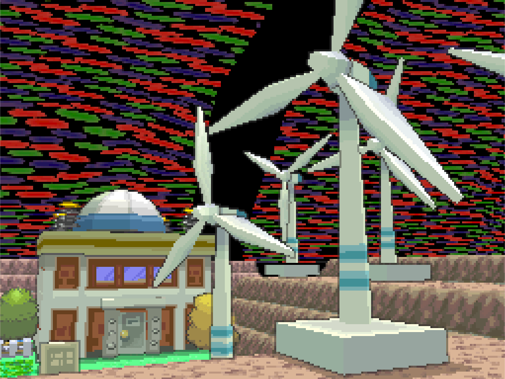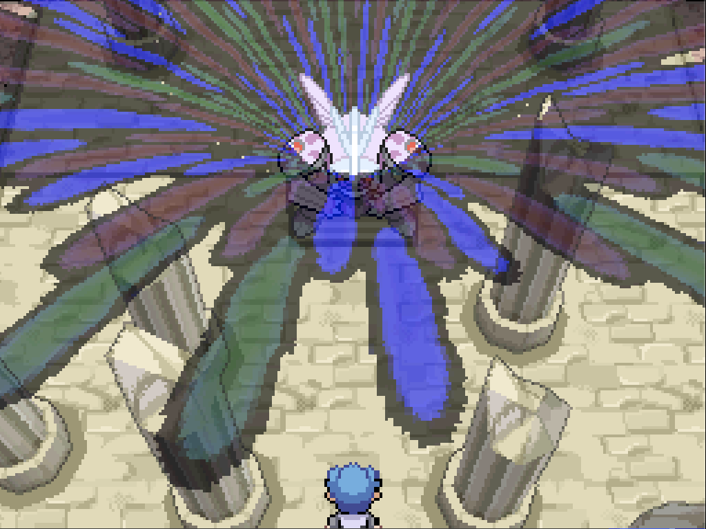 These waves of red, green and blue light spreading across all of Sinnoh represent the distortion of space and time as Palkia begins to break down the dimensions in preparation for creating Cyrus’ new world. The pattern of those three colours makes me think of the three little cells of red, green and blue that make up a single pixel. I wonder whether the artists for this scene could have meant that as a sly little nod to the fact that all of these characters live in a universe made up of the pixels on the screens of a Nintendo DS; Pokémon occasionally makes little fourth-wall-breaking jokes like that (for instance, always having an in-game location where you can meet one or more of the game developers, like Junichi Masuda hanging out in a suite at the Hotel Grand Lake).