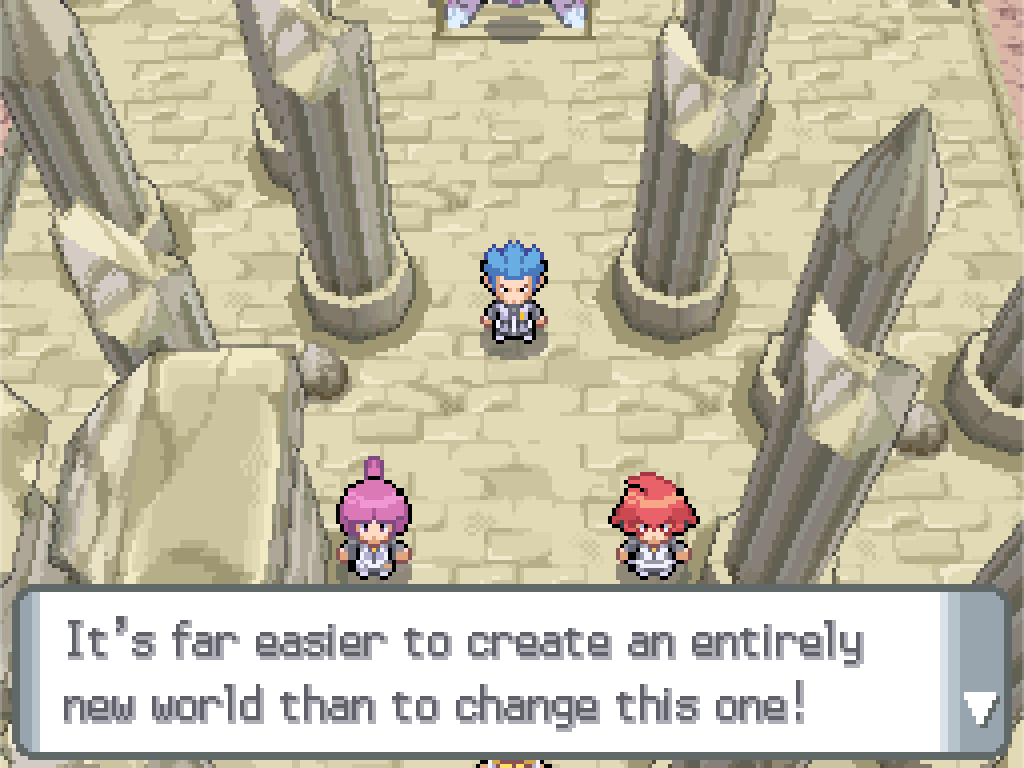 As of Diamond and Pearl, Cyrus believes that the Pokémon he is summoning – either Dialga or Palkia – is the creator deity of Sinnoh’s myths. At this point we have no reason to believe he’s wrong, either; this is 2007 and Nintendo won’t officially admit that Arceus exists for another 2 years (although thanks to data miners we all knew about it long before then). In Platinum Cynthia gives us some hints later that she thinks Cyrus has misinterpreted the mythology, but I don’t think any of that is present in Diamond and Pearl – it kinda hinges on Cynthia knowing about Giratina, who is present in the original games but plays no role in the plot and is more of an out-of-the-way secret for players to stumble on. I’m interested to see how Timey Diamond and Spacey Pearl will handle this, because it doesn’t seem like they’re supposed to be true rewrites in the vein of Omega Ruby and Alpha Sapphire. If you release the same game again in 2021 with no changes to the story, it’s just painfully obvious that all the characters are wrong about some fairly crucial plot stuff, but they never find out and it doesn’t matter.