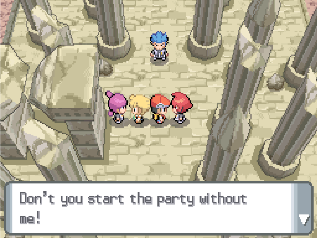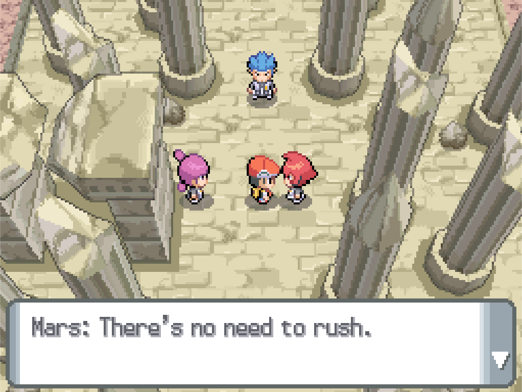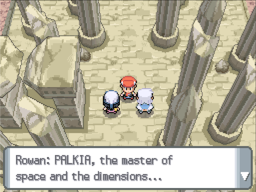 Okay, apparently you do reset to Hearthome City (or wherever else you last visited a Pokémon Centre) but you don’t have to fight Team Galactic all over again. When you make it back to the top of Mount Coronet with your restored team, Professor Rowan and Dawn are waiting there to give you the same speech again. I think a later Pokémon game would have healed your Pokémon and let you try again or something (or at the very least, healed you before making you try the first time). I think a Pokémon game that I wrote would have just given you a comical line about how Palkia wore itself out beating the $#!t out of you for six hours and then flew away for a tropical island holiday in the Sevii region.