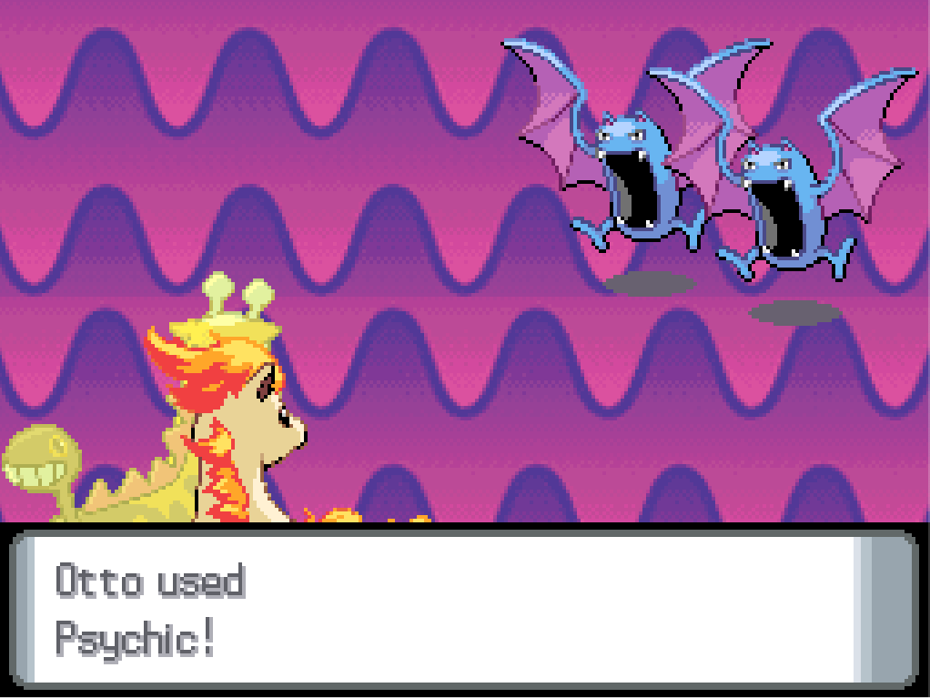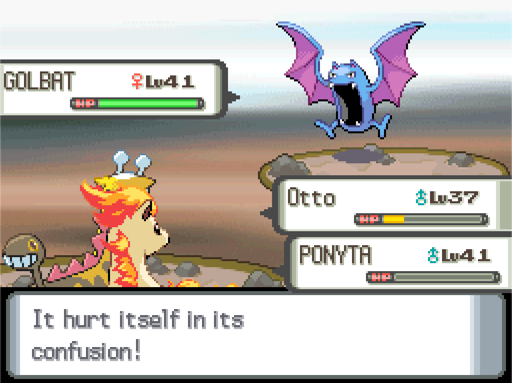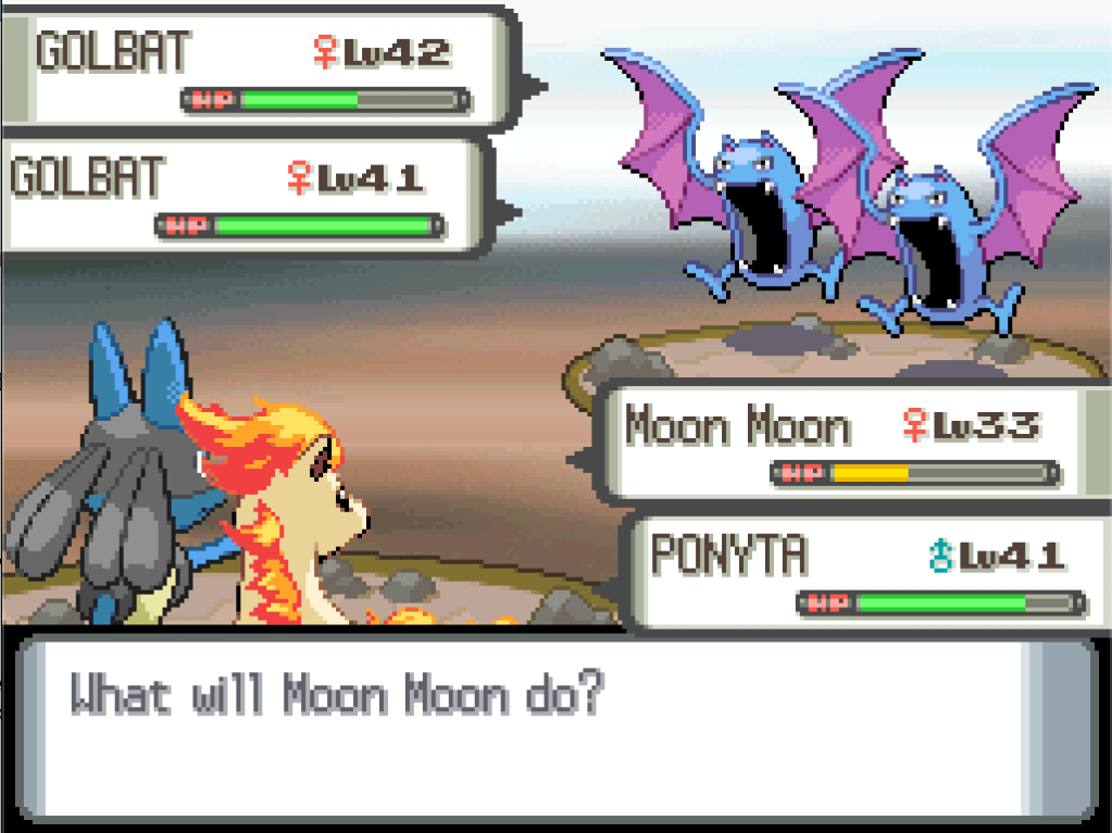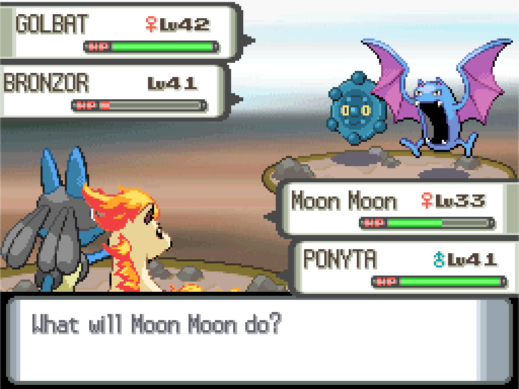 Barriam has graciously chosen not to evolve his Ponyta at level 40 out of solidarity with Madame Malheur (who is not allowed to evolve because of the Hanged Man). Golbat is Mars’ last Pokémon, so if we take it down we can 2v1 Jupiter, but I have to imagine Barriam’s Ponyta will take the easy win against Bronzor instead.