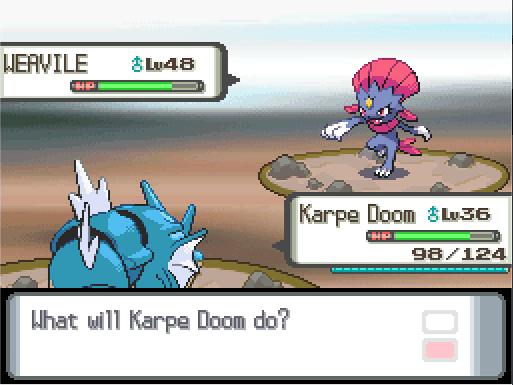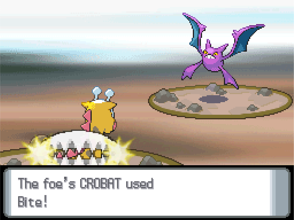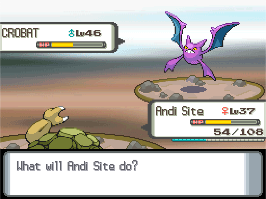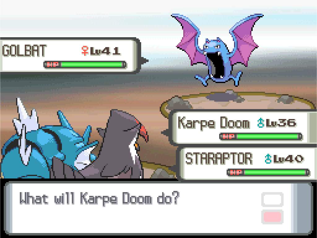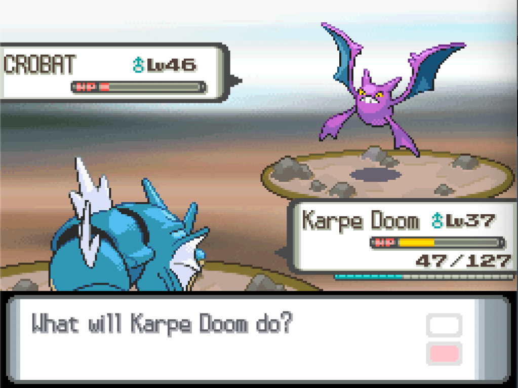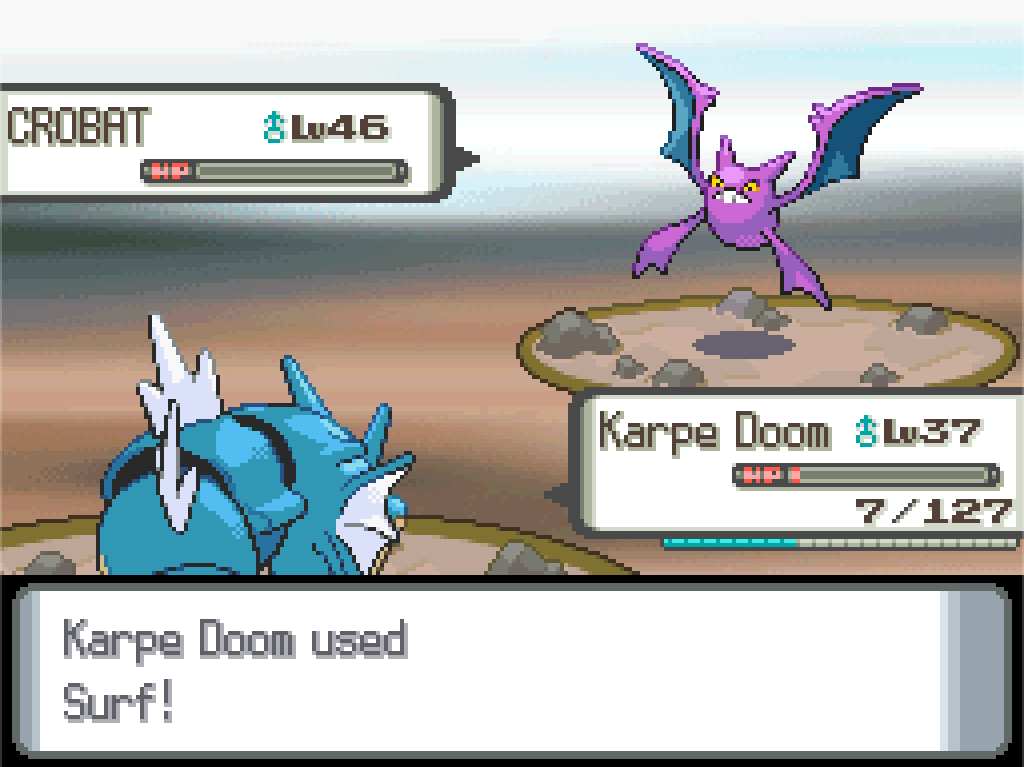 Andi’s Quick Claw just triggered twice in a row, but frankly, she’s a Golem; her special attack is garbage and two Fire Blasts are just not enough to finish off Crobat from this position (although I am definitely buying her a whole pile of calcium tablets if we get out of this). I guess it’s up to Karpe Doom to finish things again…