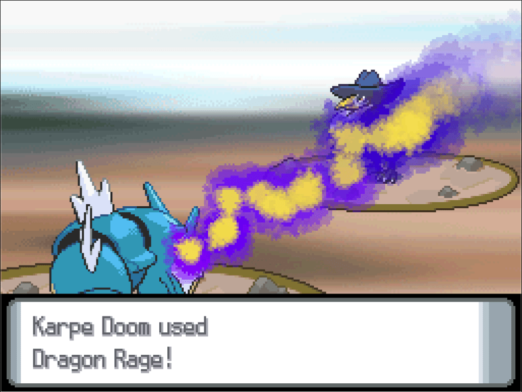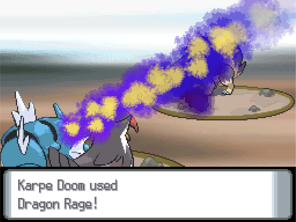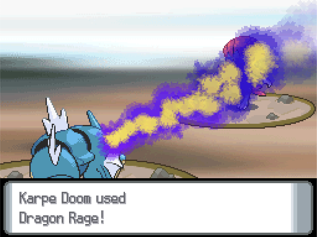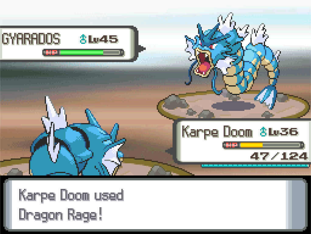 Karpe Doom isn’t allowed to use physical attacks, but to be honest, with such a big level discrepancy in play, Dragon Rage might the best move we’ve got in any case.
