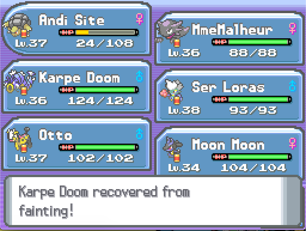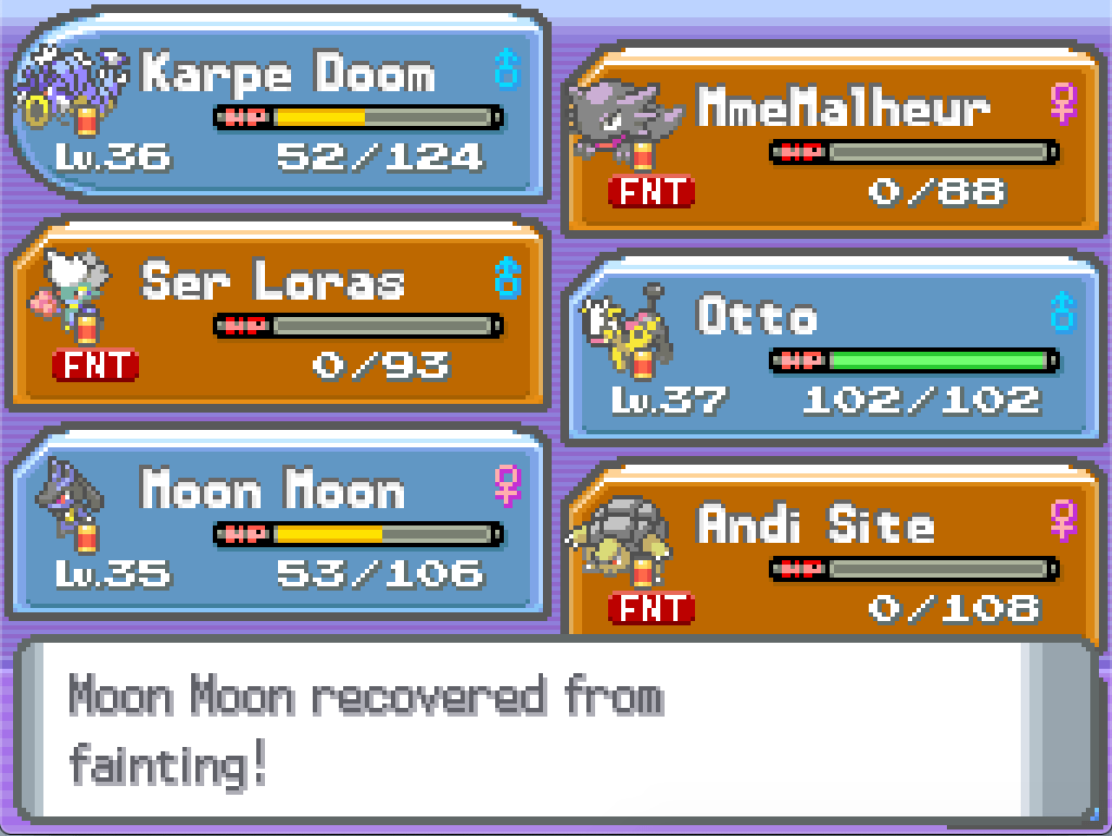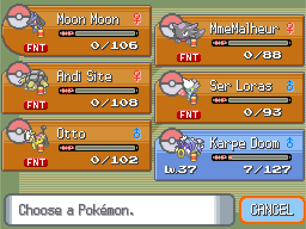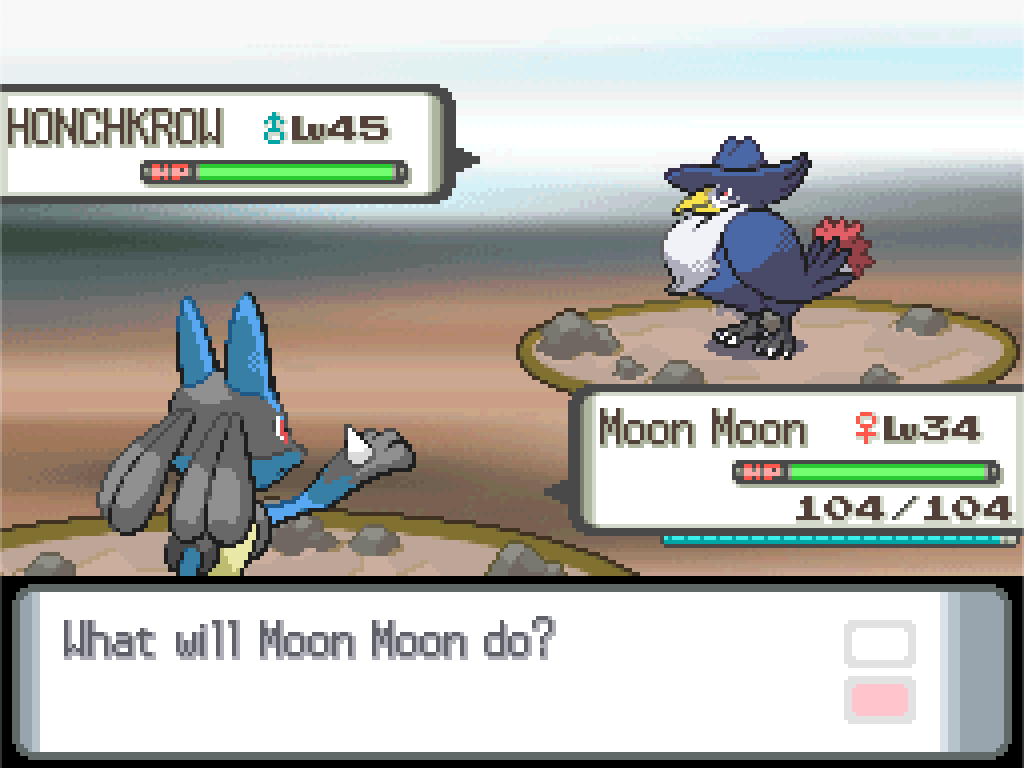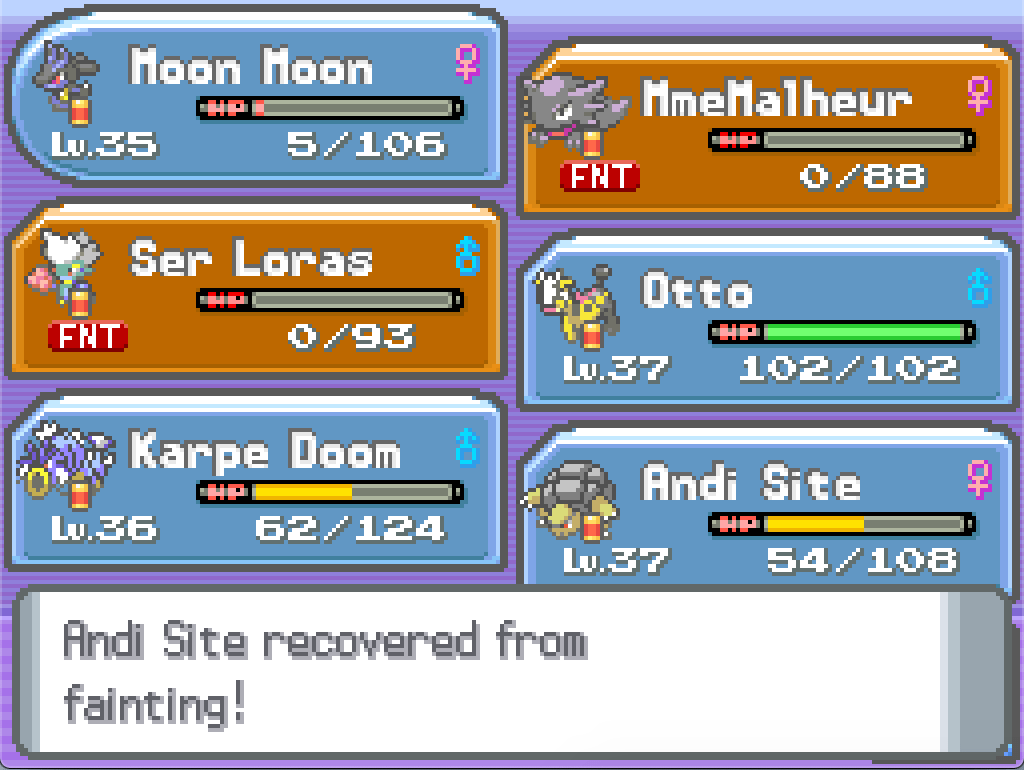I think the play now is to send in Andi, see how much damage she can do with Fire Blast, then hopefully revive Karpe Doom so we can come in with another Intimidate. I don’t think any of my other Pokémon can stand up to Honchkrow; Moon Moon would have a shot if she were a higher level, but Madame Malheur, Ser Loras and Otto will all get wrecked.