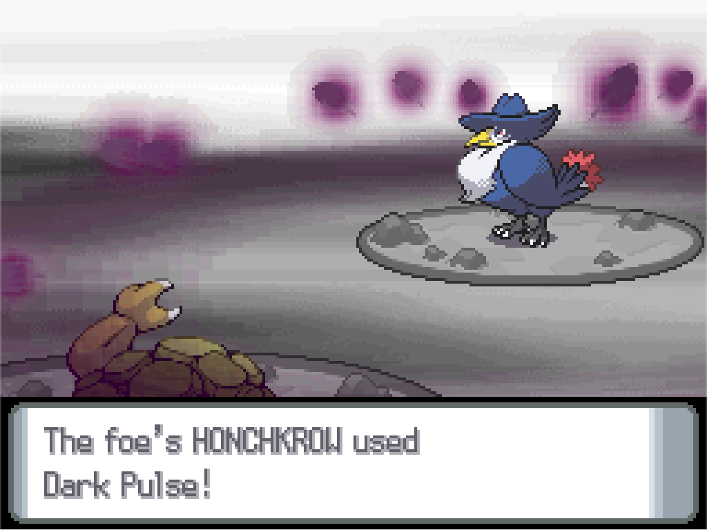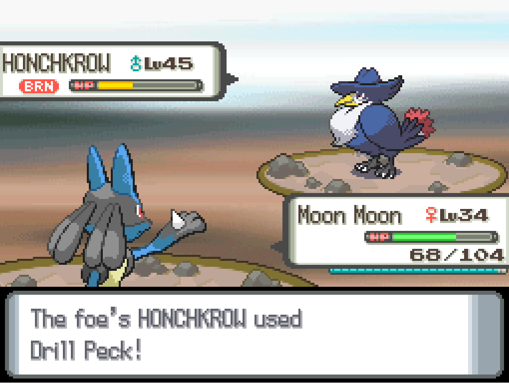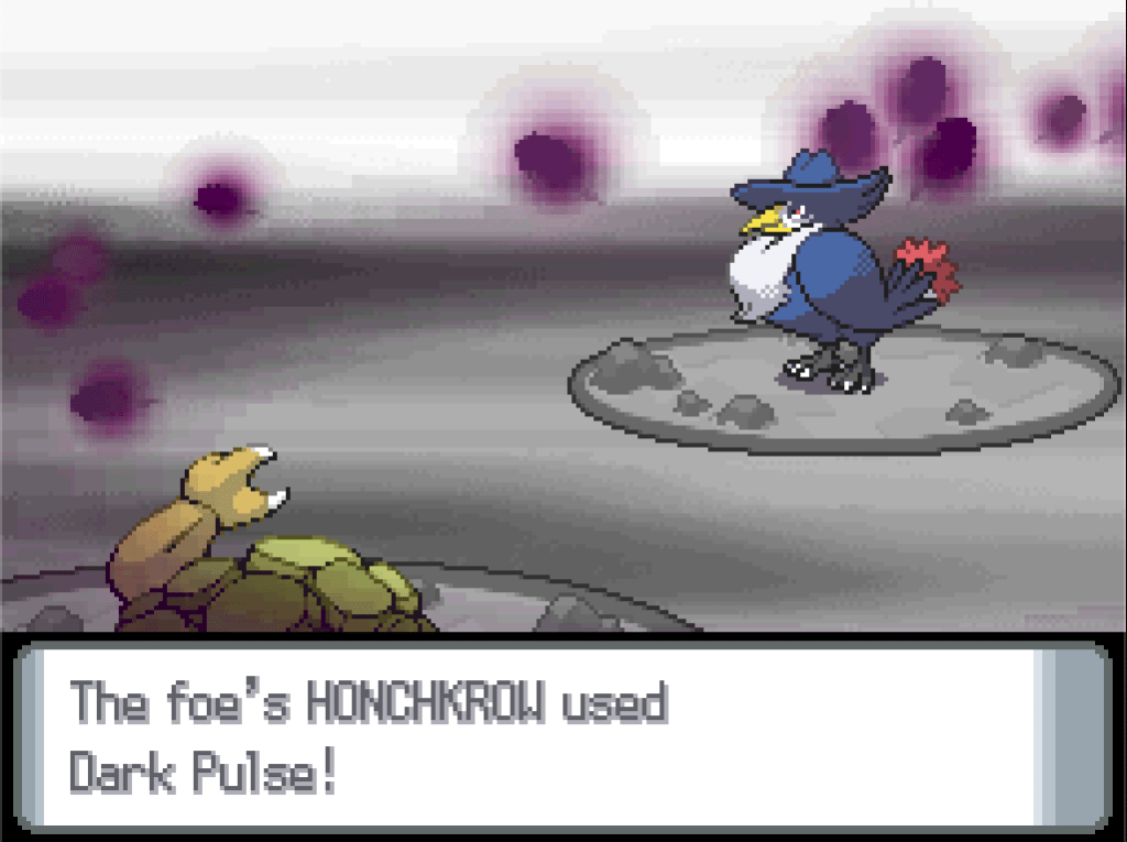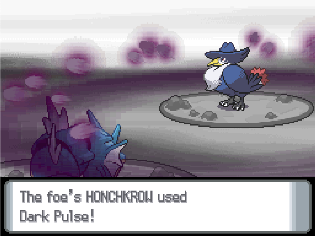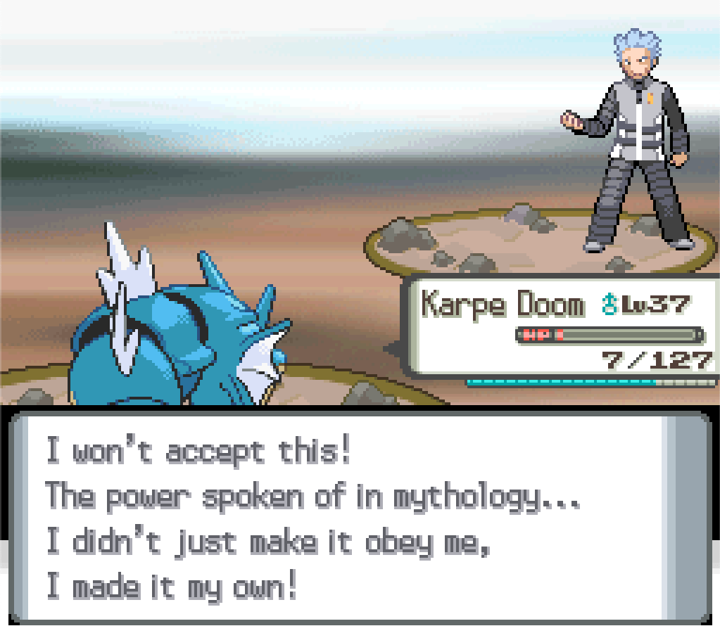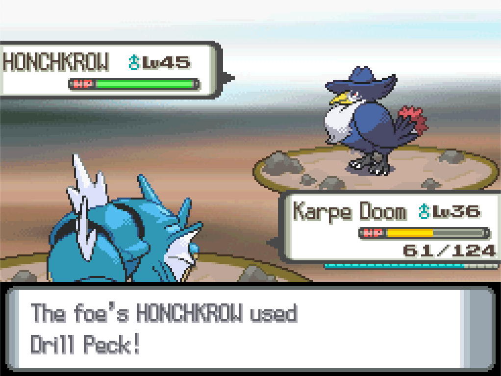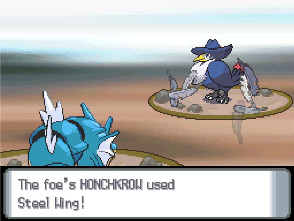 Fortunately, Cyrus isn’t very clever and opts for Steel Wing instead of finishing Karpe Doom with Drill Peck, but Dragon Rage isn’t cutting it; HP is Honchkrow’s other high stat and this one has a total of about 160 by the looks of it.