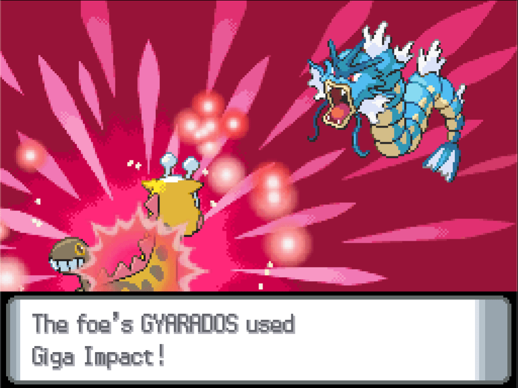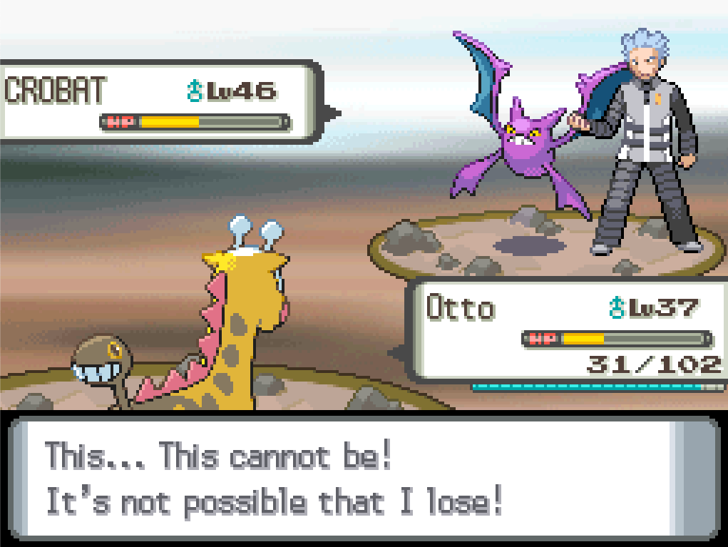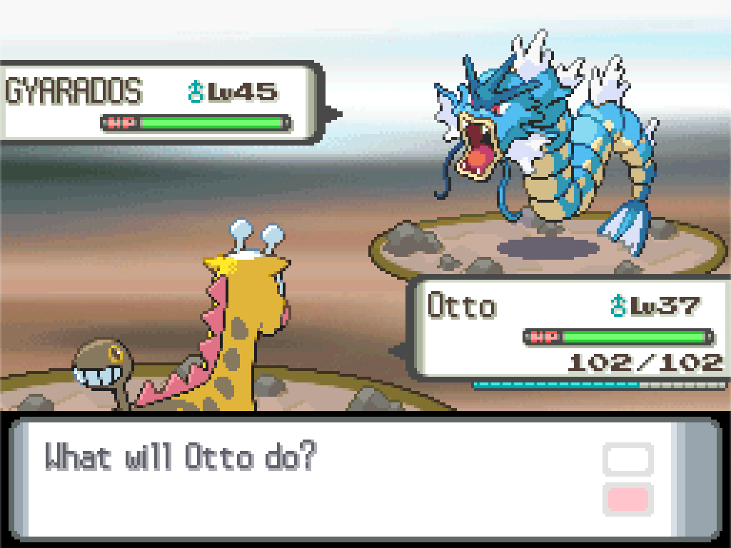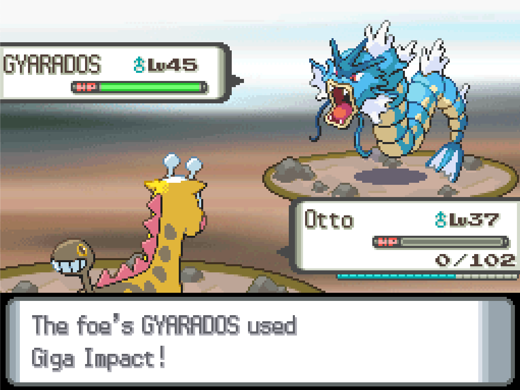 Cyrus’ next Pokémon is Gyarados and I’m going to take a gamble on Otto’s Thunder here. I’m relying on several things going right: one, that Gyarados won’t just one-shot Otto with Bite or something; two, that Thunder will actually hit; three, that it will do enough damage to one-shot Gyarados (ordinarily this is a good bet, but that 8-level difference is doing a lot of work here).