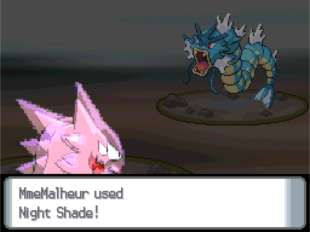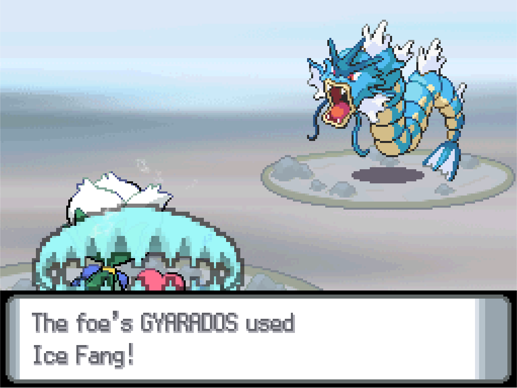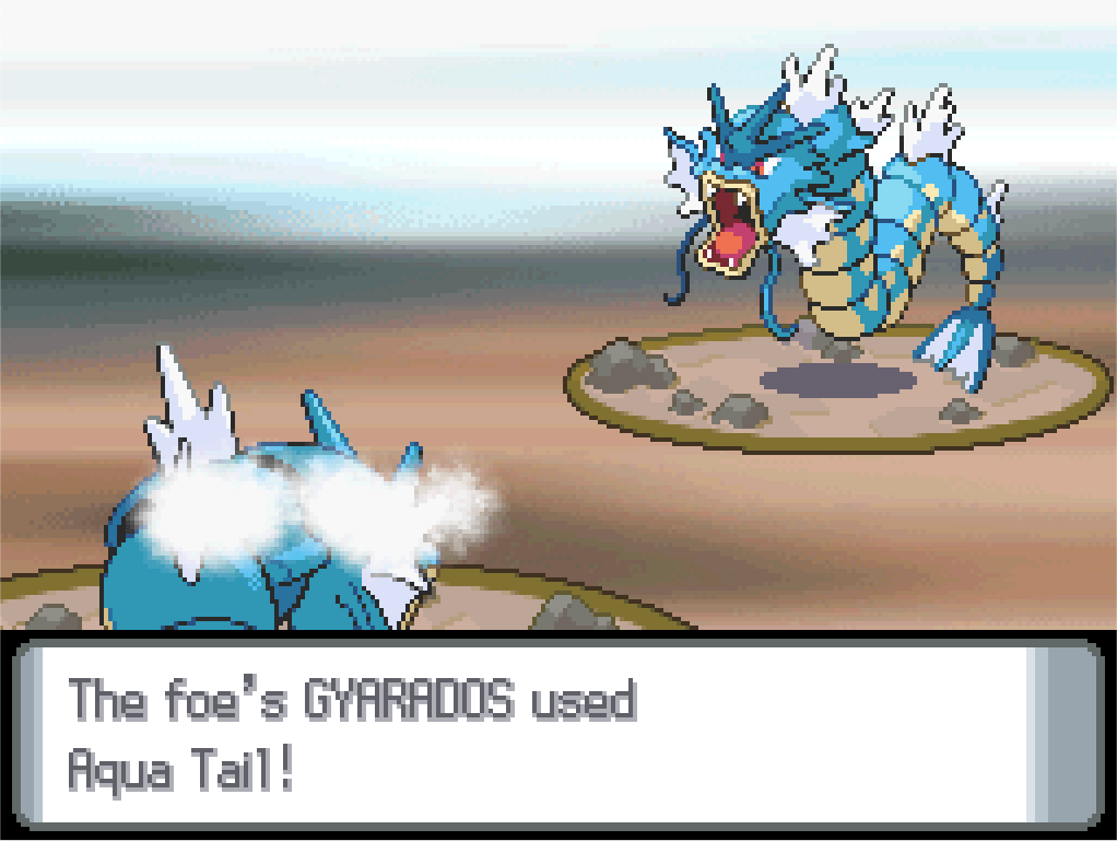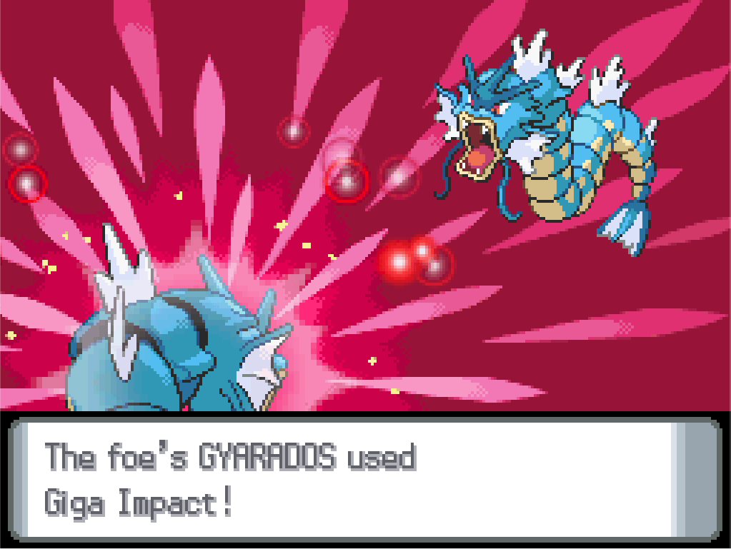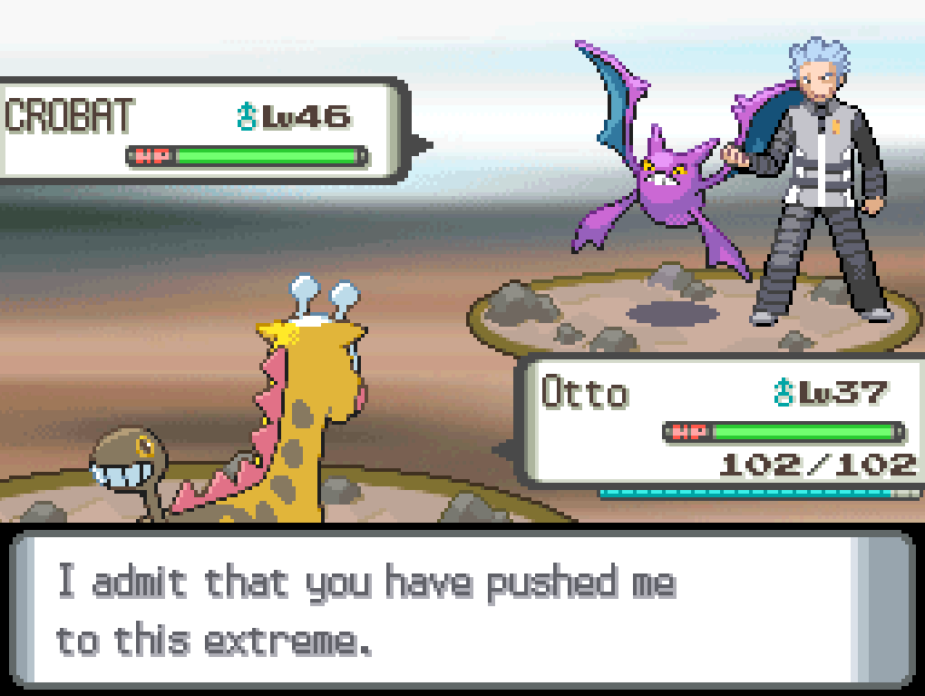 Cyrus’ next Pokémon is Gyarados and I’m going to take a gamble on Otto’s Thunder here. I’m relying on several things going right: one, that Gyarados won’t just one-shot Otto with Bite or something; two, that Thunder will actually hit; three, that it will do enough damage to one-shot Gyarados (ordinarily this is a good bet, but that 8-level difference is doing a lot of work here).
