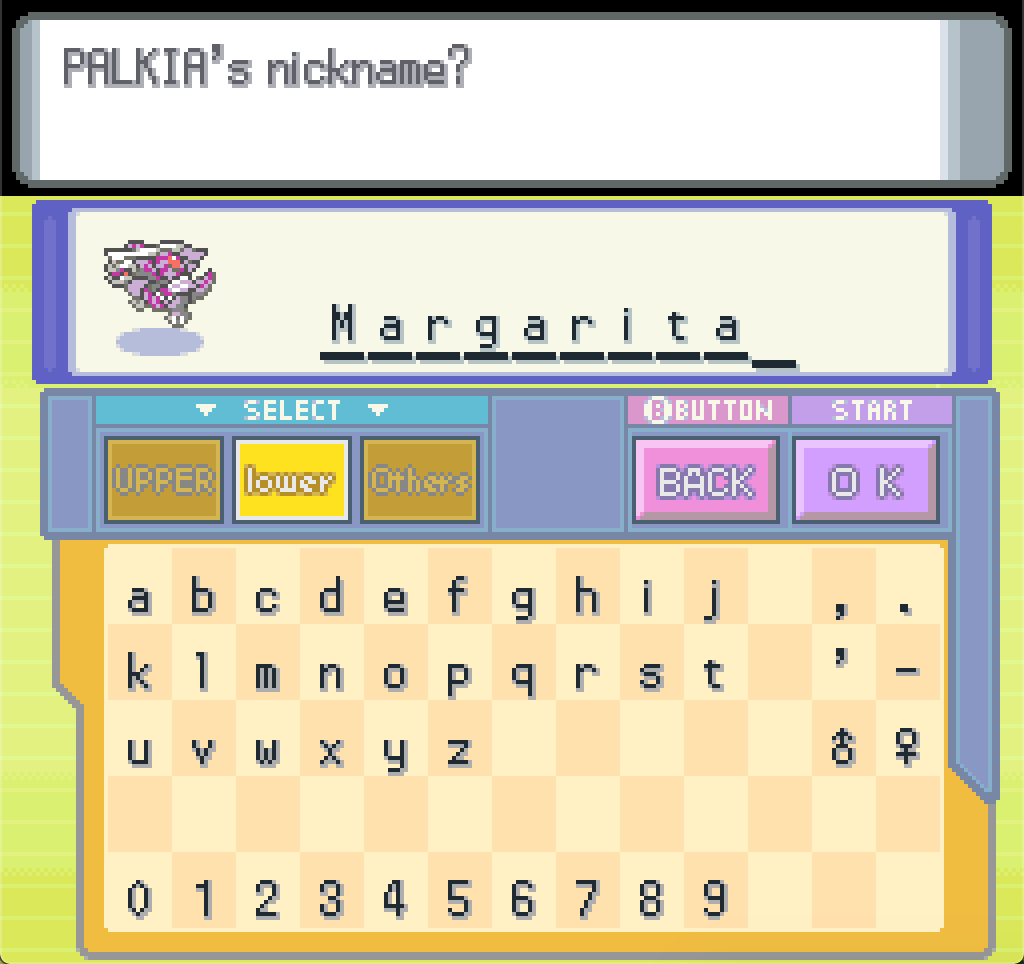 I haven’t written rules for using legendary Pokémon in the Kingslocke and for the purposes of this run I’m going to consider them off-limits (although I’m going to try to catch Palkia anyway). For my rule revision at the end of the run, I’m tentatively thinking that maybe you should be allowed to catch legendary Pokémon, but you may not use a Master Ball, and they automatically start off “sealed” as if they’d been hit by an Eight or a Snake Eyes or something, so you need another card like the Sun to help you gain access to them.