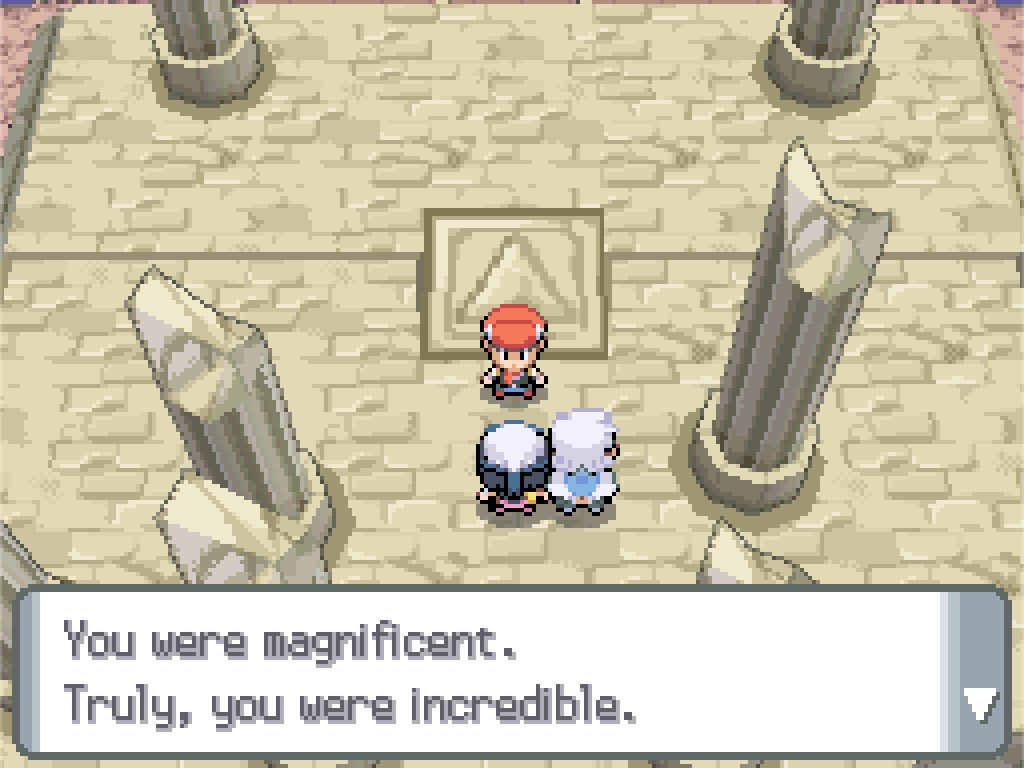 Forgetting about the metaphysics of whatever is supposed to be happening here, the point in terms of the story is clear: we win because the lake spirits, and particularly Mesprit, the “being of emotion,” help us in our hour of need, in return for the kindness the player showed by freeing them. I would have liked to see a bit more of the story of these three, and particularly the player’s special connection with Mesprit – the embodiment of emotion, the thing Cyrus hates most of all, the guardian of our hometown’s sacred lake, as well as the Pokémon that began our journey in the first place (Barriam took us out to Lake Verity because he knew there was supposed to be a legendary Pokémon living there and wanted to find it; Mesprit is the reason the protagonist of Diamond and Pearl became a Pokémon trainer). But maybe it’s fine leaving some of this stuff implied.