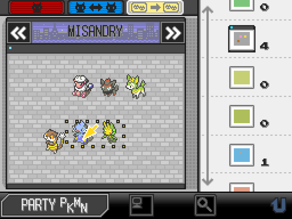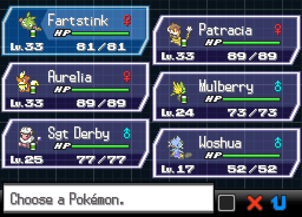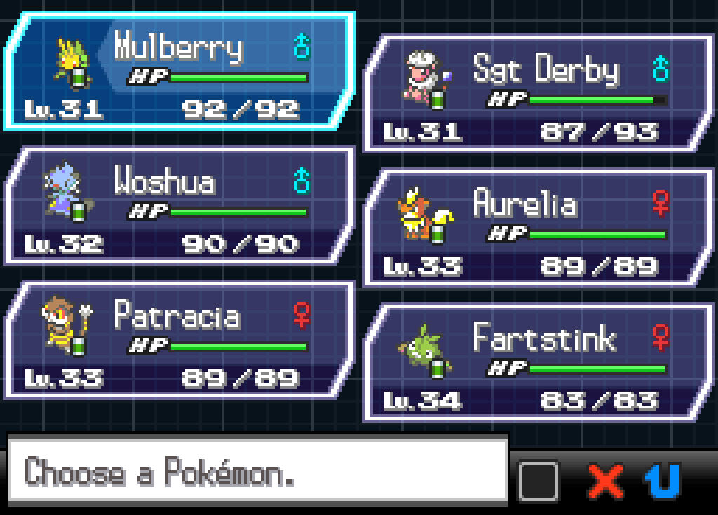 So, thanks to the blessings of the Sun, we have free choice of which Pokémon to put on our team once again – but we’re not totally free. Our Pokémon still can’t evolve or use their STAB moves, which we need to consider in putting together a new team. Fartstink is a no-brainer; as our Champion, she doesn’t observe the same restrictions as the others, and frankly, she’s earned it. Salt, Pepper, the nameless Zorua and the new Yamask Nefertiti are all pretty severely hampered by not being able to evolve; it’ll also hurt Woshua and Sergeant Derby (who won’t be able to earn his next promotion), but not as badly. It doesn’t make a lot of sense to have both Alvin and Patracia active, and I think Patracia’s earned the right to go on leading the party and smashing the Patratriarchy for a while. I hate to separate Alvin from his boyfriends again, but at least now they know they’re all safe and they can see each other at every Pokémon Centre stop. Finally, as powerful as Invicta is, the Elements rule hobbles her pretty badly. Her only usable attack right now is Gust, and we can replace that with Fly because HMs are always fair game in a Kingslocke, but Fly is also too strong to be usable with Temperance in play. For now, Invicta will invest her divine power in her newly anointed paladin, Aurelia. That narrows it down to six Pokémon: