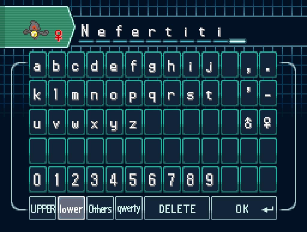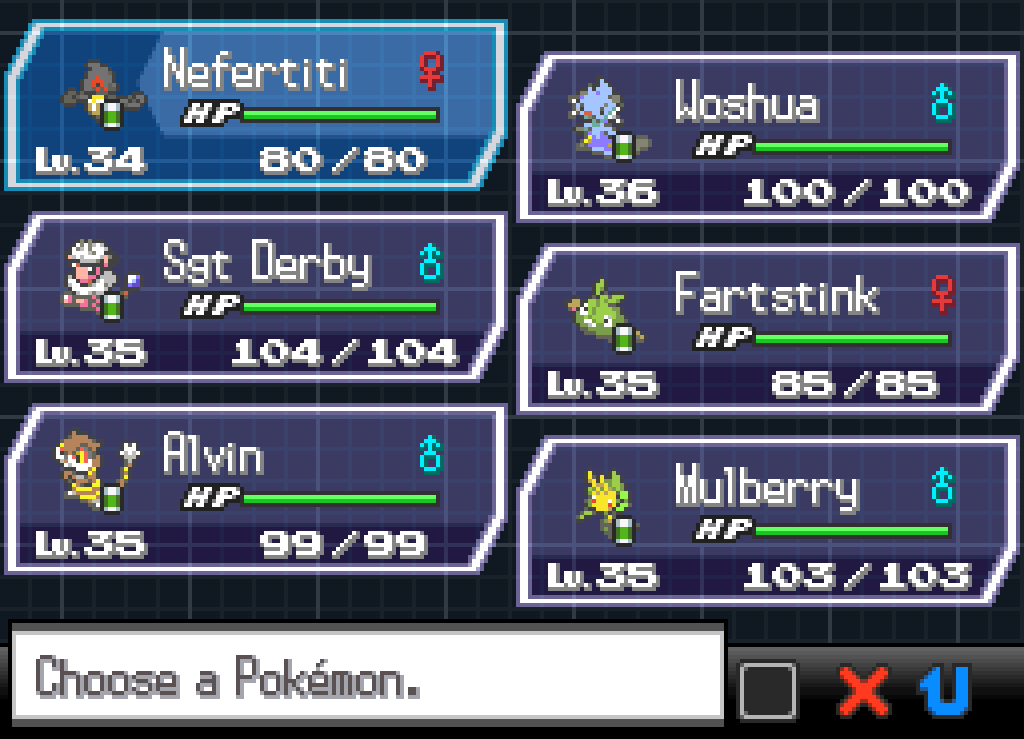 My previous logic for not using Invicta continues to apply. Yu’effoh has two attacks, Zen Headbutt and Hidden Power, but purely by chance her Hidden Power appears to be Psychic-type, which means she has no non-STAB attacks. If I want to use her, I’ll have to teach her Return, which wouldn’t be terrible but wouldn’t be great either; her physical attack stat is on the “meh” side and she isn’t compatible with any good TMs I have for special attacks. Locked evolutions will make just about all my other backup Pokémon pretty bad; I think for now my best option for my final team slot is probably Nefertiti, who can at least get around the Elements rule with Night Shade. I’ll just level her up a bit before taking on the gym (continuing to pay tithes for healing, obviously; I am broke).