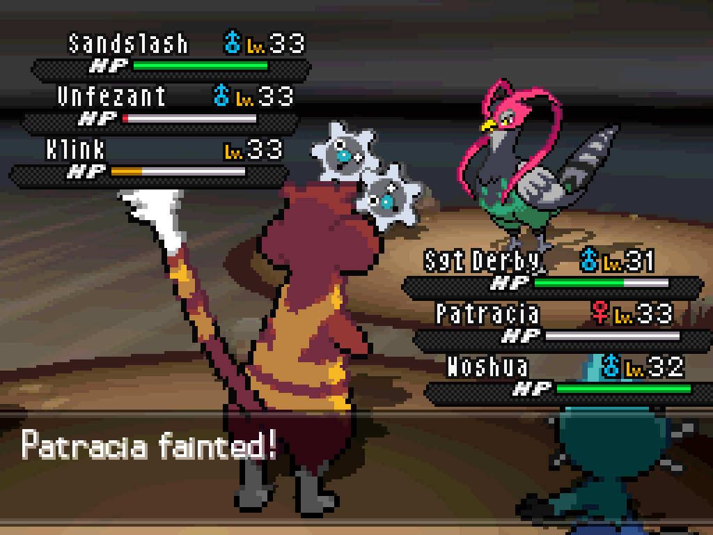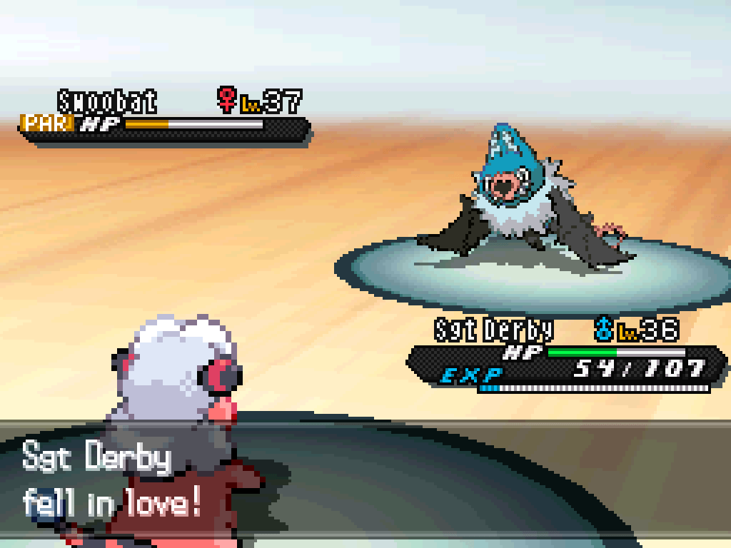 god, the interpersonal dynamics of which Pokémon I put in the Vessel are genuinely so complicated here; like, sending Mulberry, Woshua or Alvin to the Vessel is obviously unacceptable after everything they’ve been through to get back together, but what happens if I send Aurelia or Sergeant Derby? Does that mean they’ve “broken up,” or just that they’re “on a break”? I mean, it does feel like they’ve grown apart and Aurelia does have her new calling to pursue, but I don’t think they’re ready to give up on this thing yet! And what will even happen if the Sergeant is newly single and working closely with his attractive and heroic ex?
