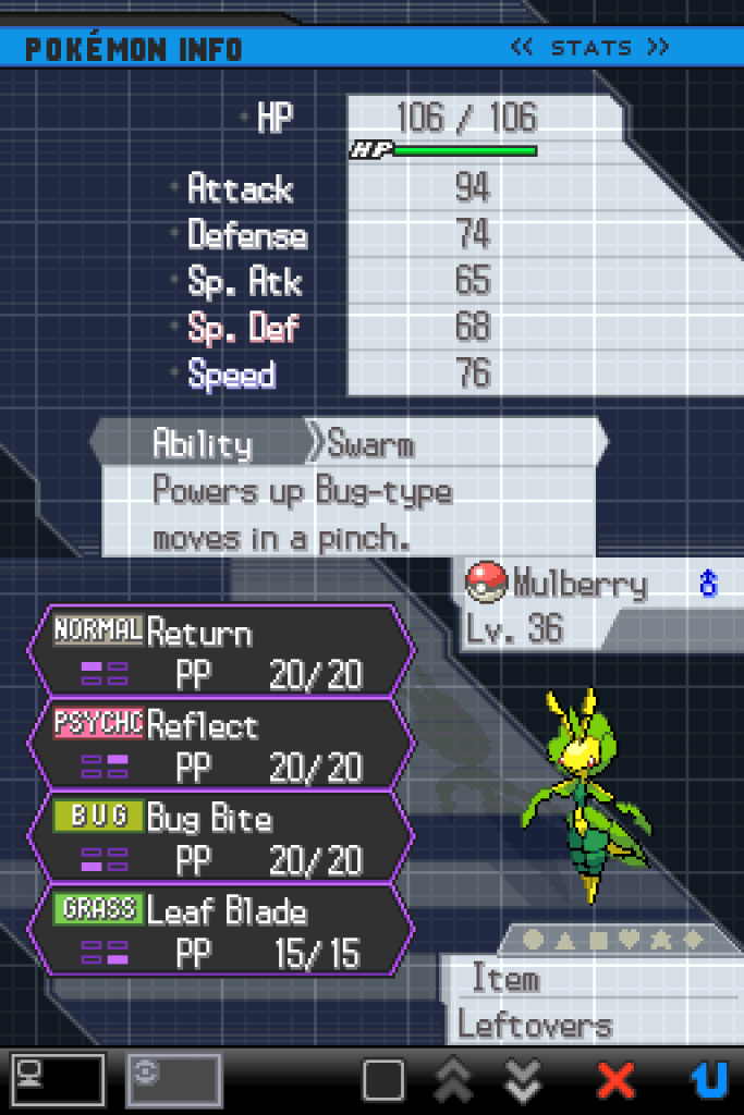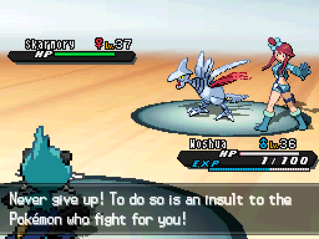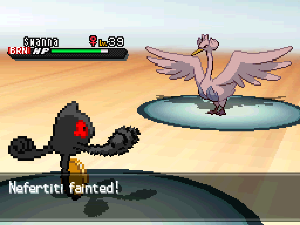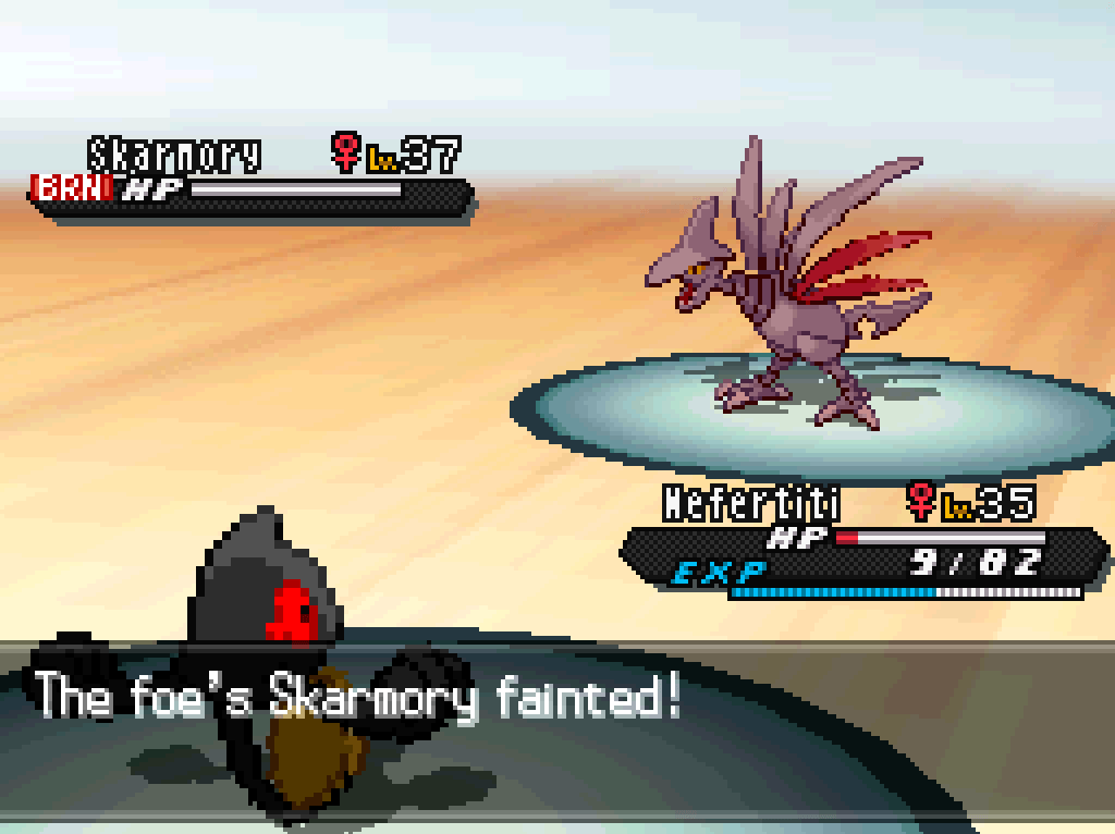 okay, with the move restrictions I’m under I’m pretty sure I just don’t have anything, at all, that can take a Skarmory in a fair fight; I’m going to have to revive Nefertiti and have her work her magic again.