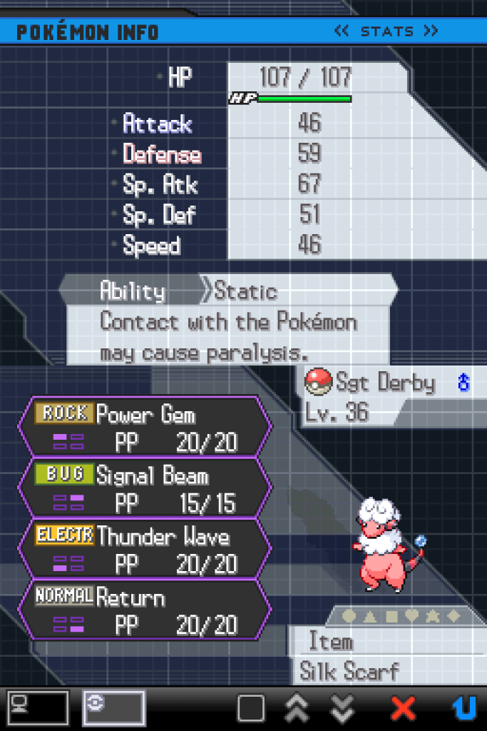 uh, pending a little bit of grinding (as much as I can afford with the Hierophant still hanging over my head) to bring the boys back up to speed. If I train in the Relic Passage, maybe I can even scrounge up enough Red Shards for another move or two from the tutor; I’d love to get Fire Punch or Signal Beam for Sergeant Derby.