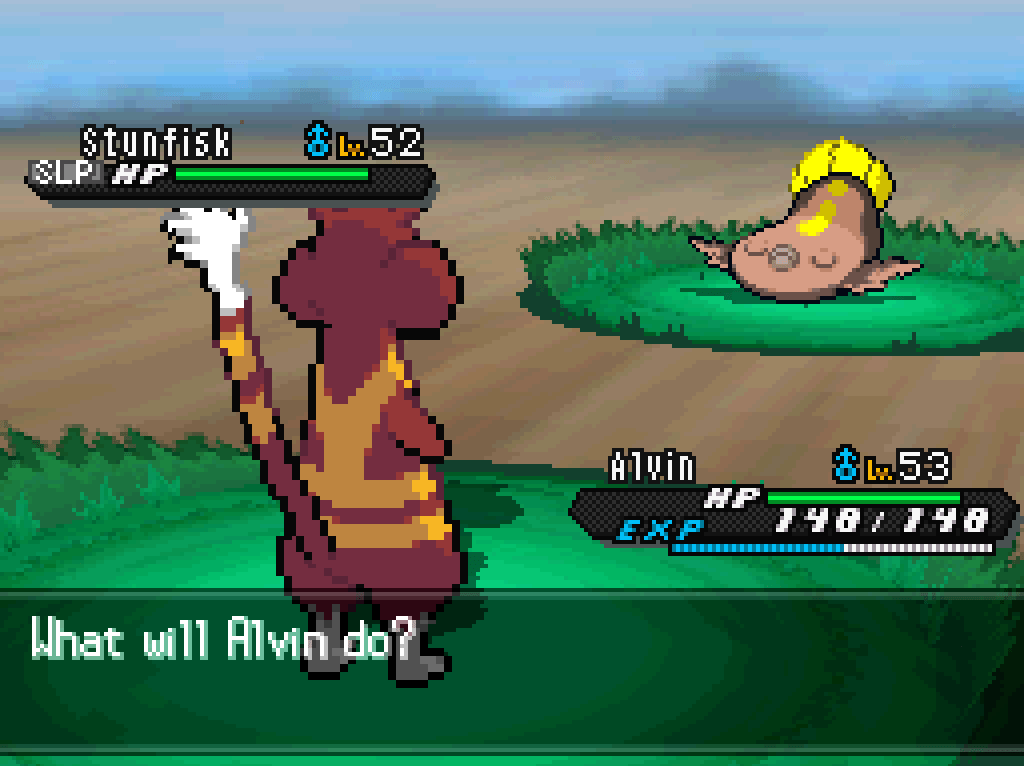 The really fun thing about having an Ace in play alongside a Four and the Magician is that sometimes you just wind up in a place where you aren’t… fµ¢£ing… allowed… to do… anything.  Alvin’s only legal direct-damage move is Thunder, which Ground-types like Stunfisk are immune to, and I’m not allowed to switch him out either.  I think technically if I can run through all his Thunder PP, I might be allowed to use Hyper Beam?  Should make my mind up about that when I write the next version of the rules.