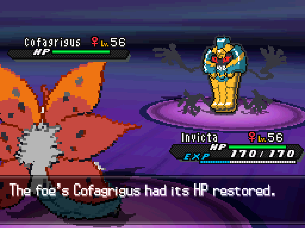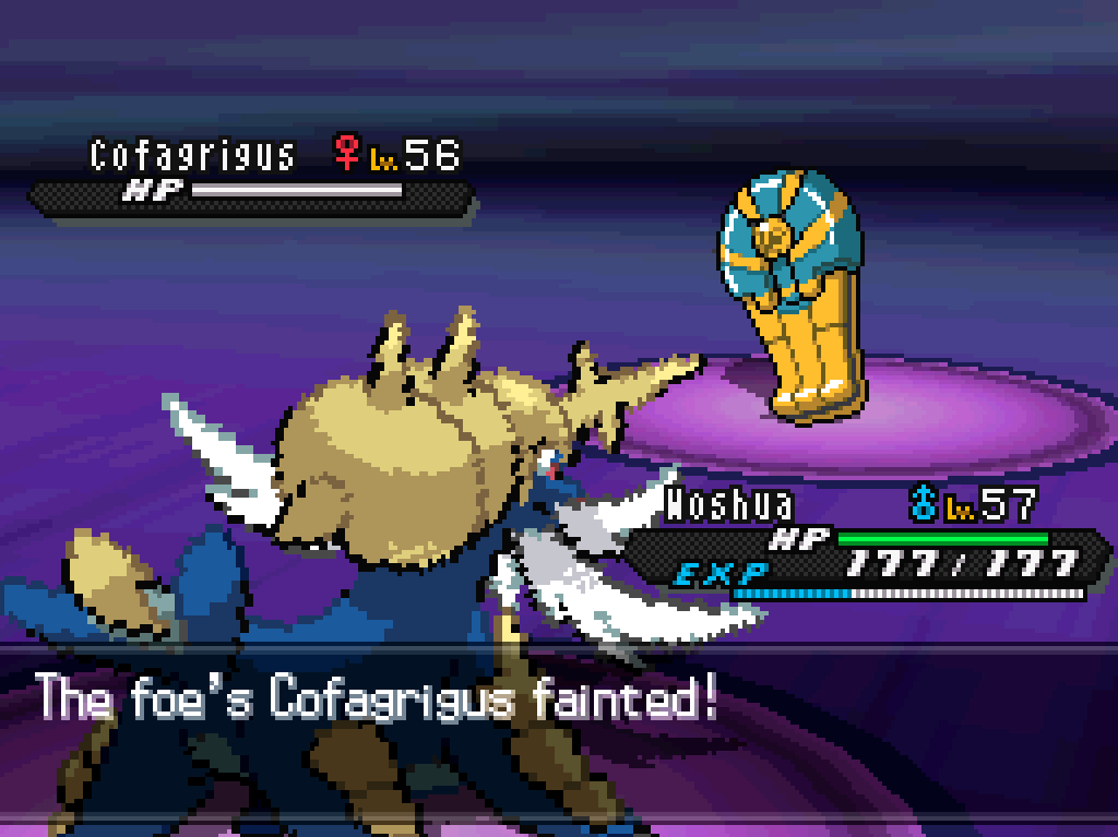 Cofagrigus’ epic physical defence is way too much for Aggron, especially once it’s been burned.  It takes another hyper potion to get Nefertiti through this, but it’s basically an easy fight.